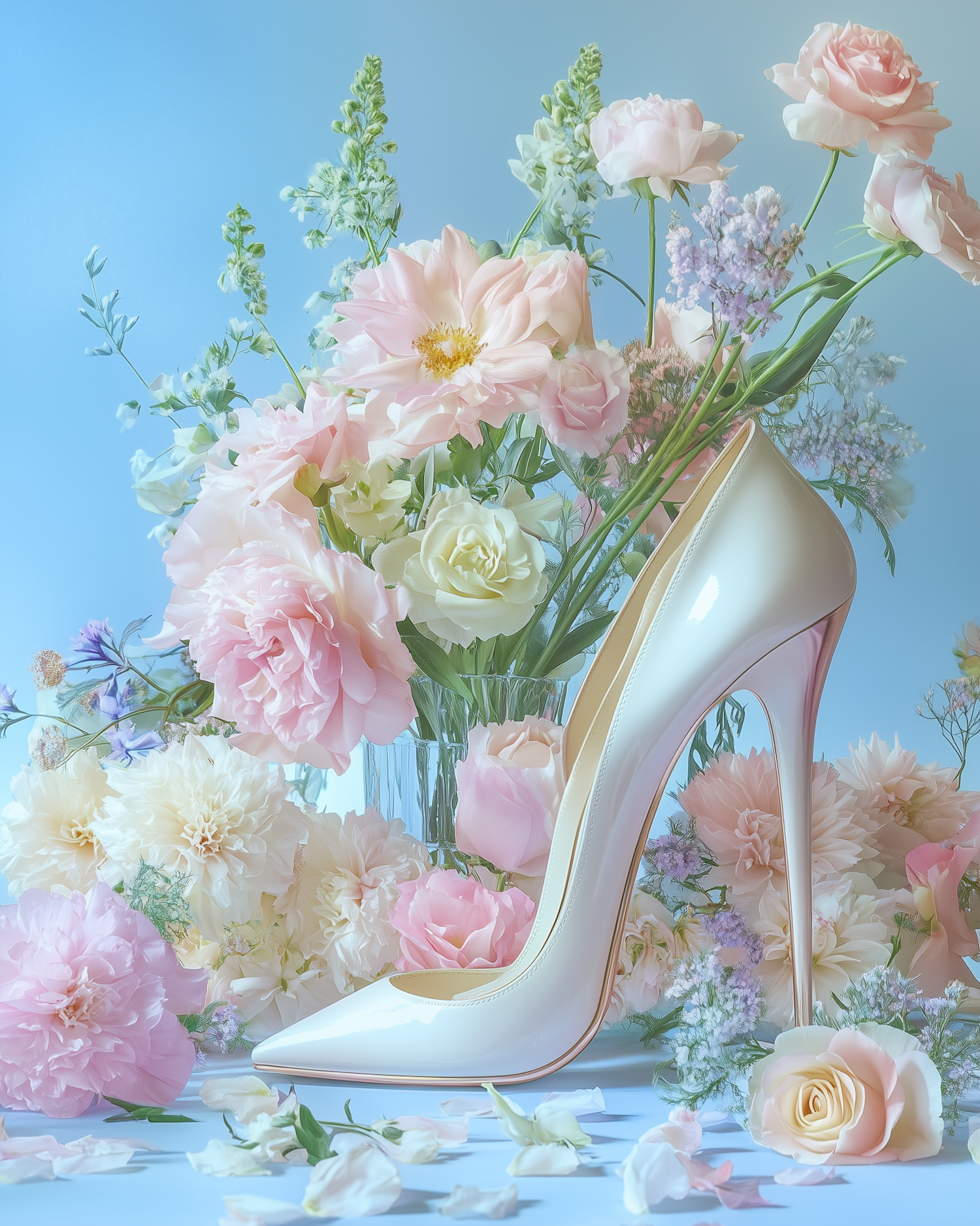 Elegant cream stiletto amidst pastel flowers, creating a romantic and luxurious scene with pink roses and white peonies.
