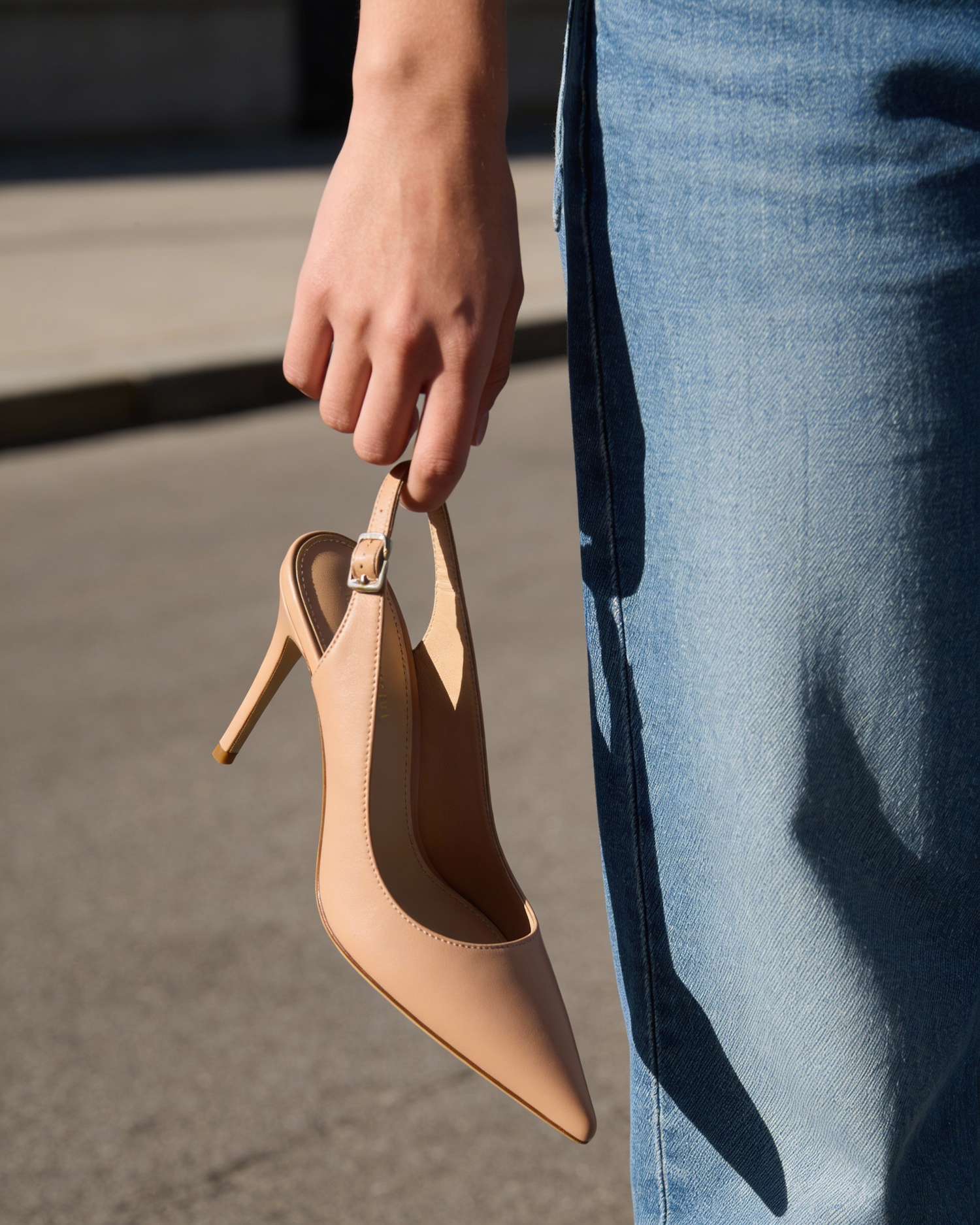 A person holding a beige high-heeled shoe by its strap, wearing blue denim jeans, in an outdoor urban setting.