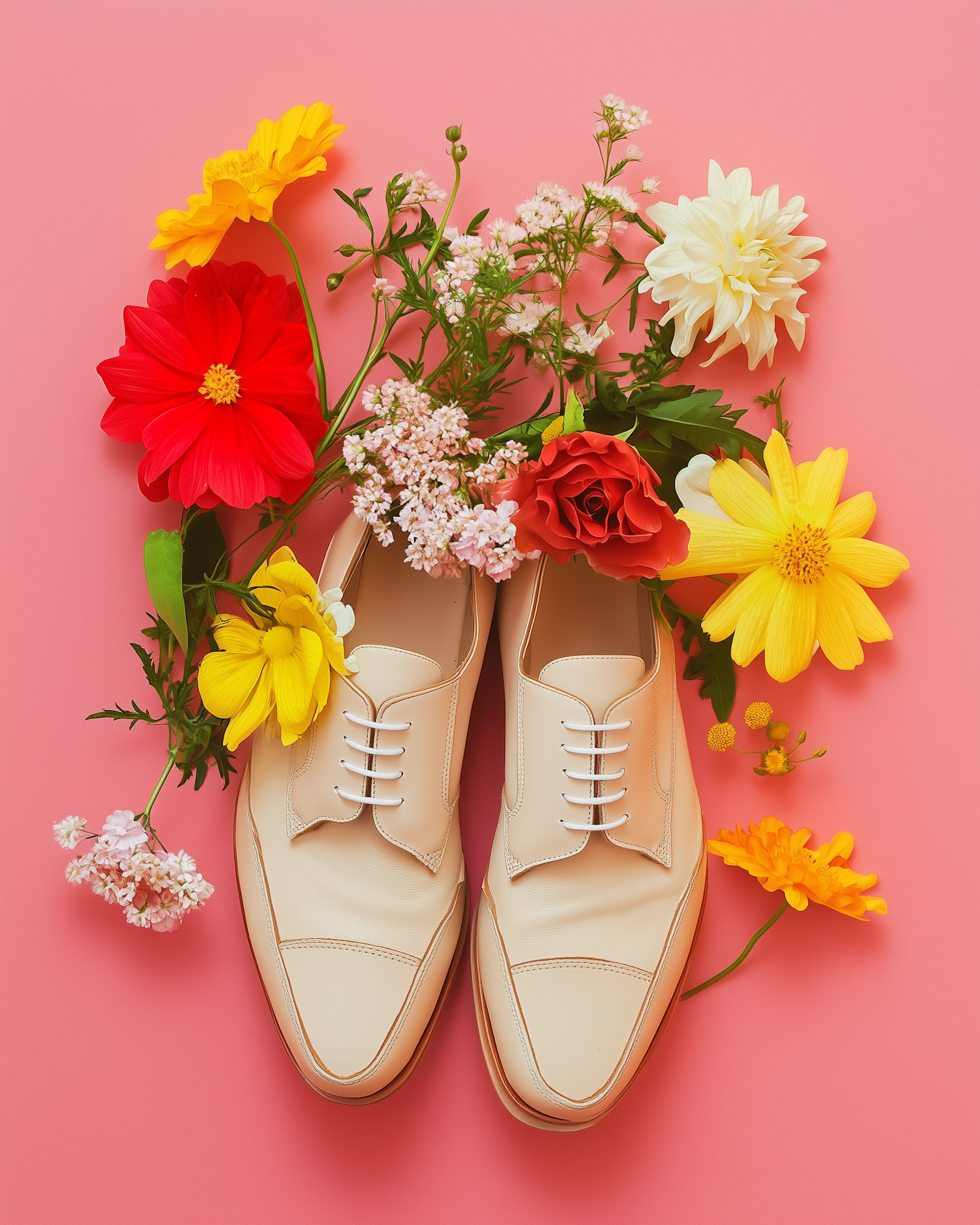 Beige leather shoes surrounded by vibrant red, yellow, and white flowers on a pink background, creating a striking contrast.