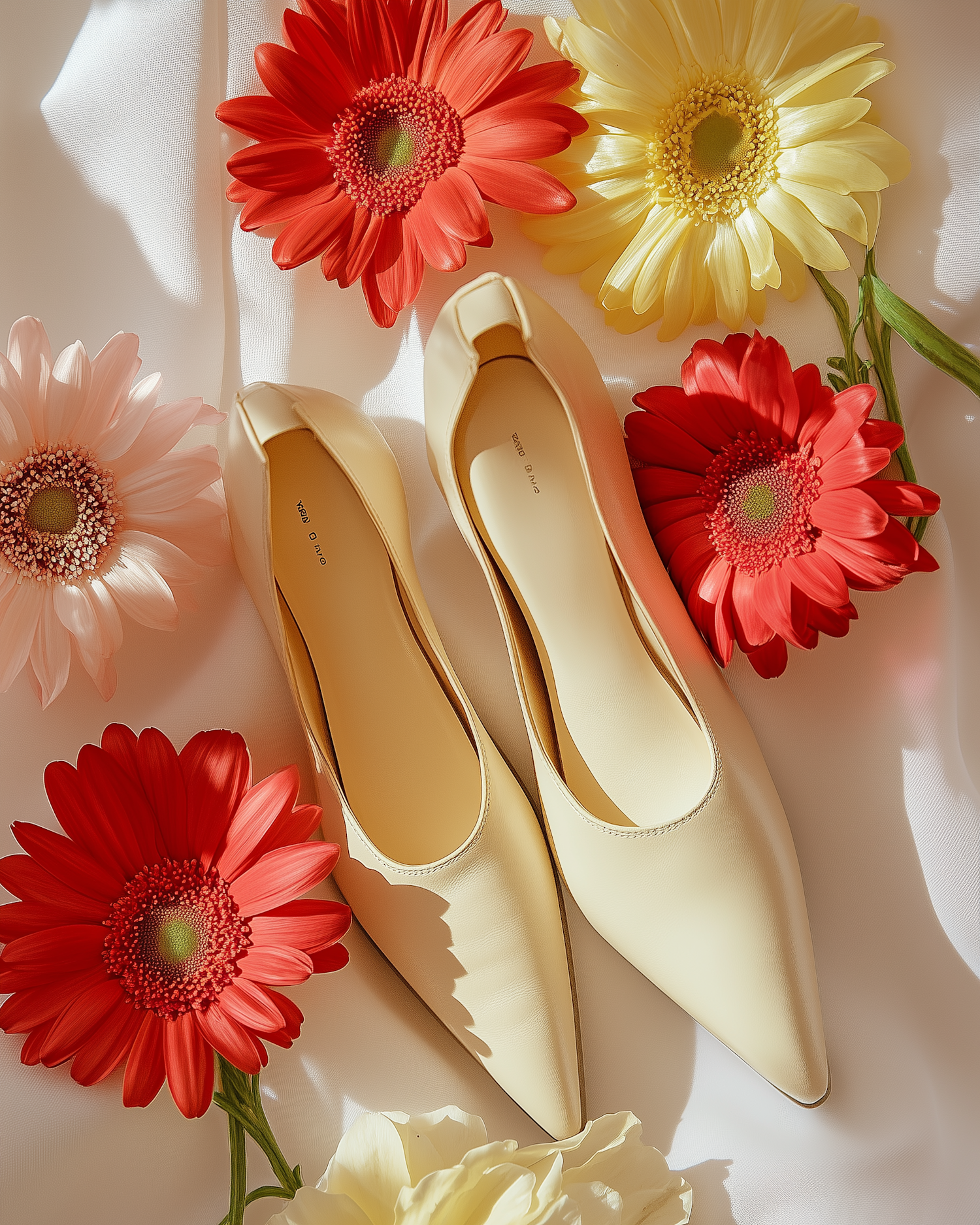 Elegant cream shoes surrounded by vibrant gerbera daisies on soft white fabric, creating a stylish and colorful composition.