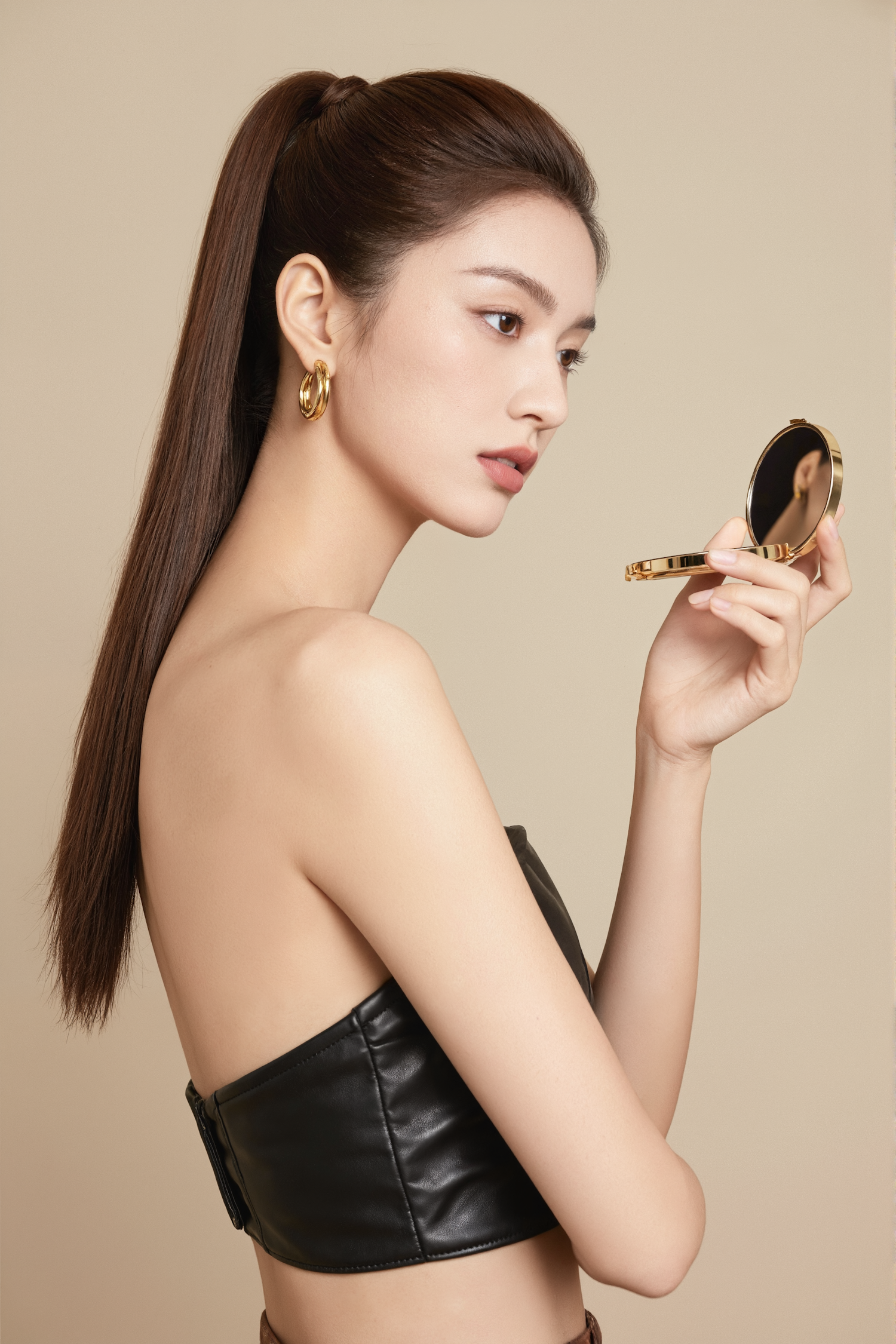 Elegant woman with sleek ponytail and gold earrings holding a compact mirror, wearing a black leather top against a beige background.
