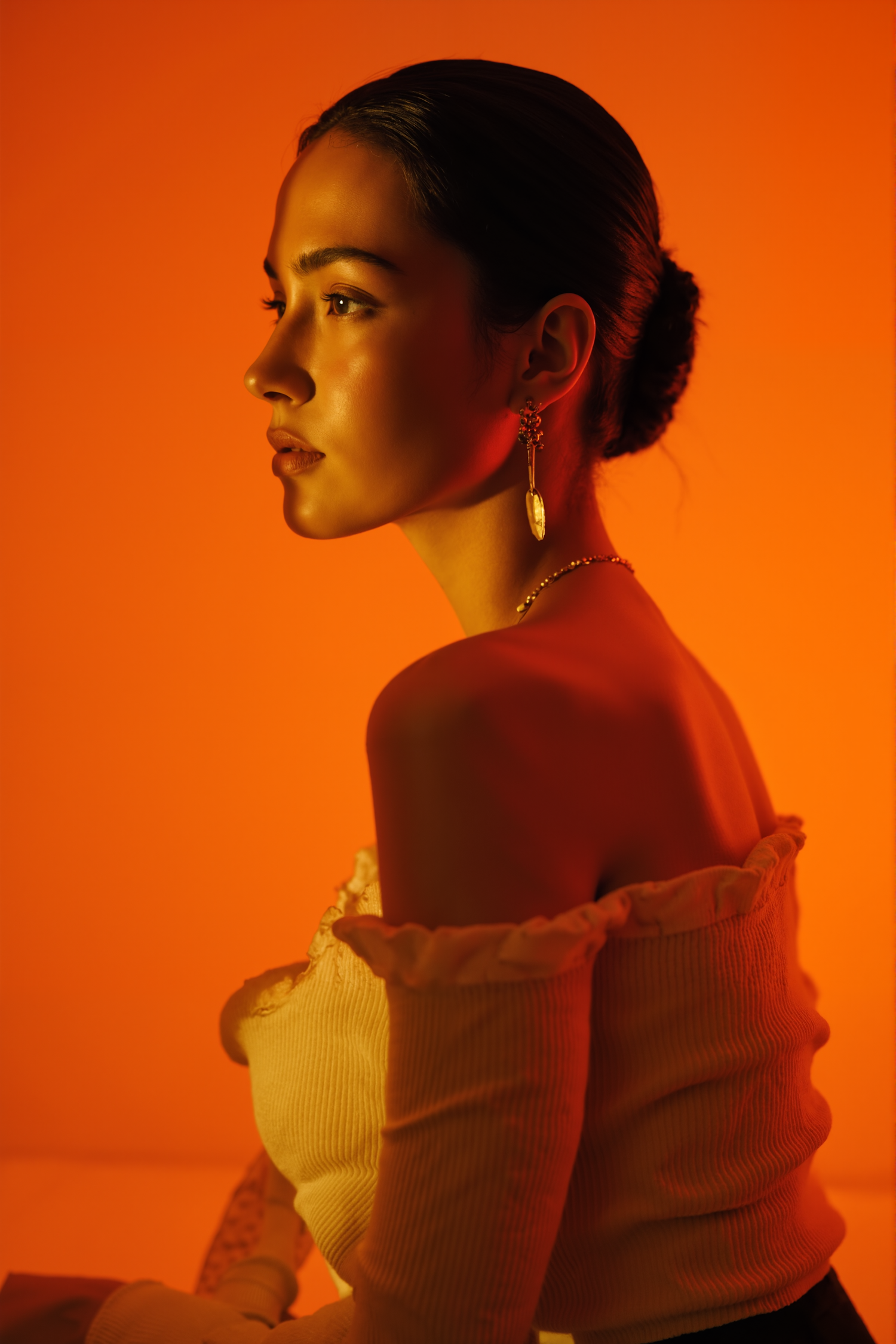 Side profile of a woman in warm lighting, wearing an off-shoulder top and earrings, set against a vibrant orange background.