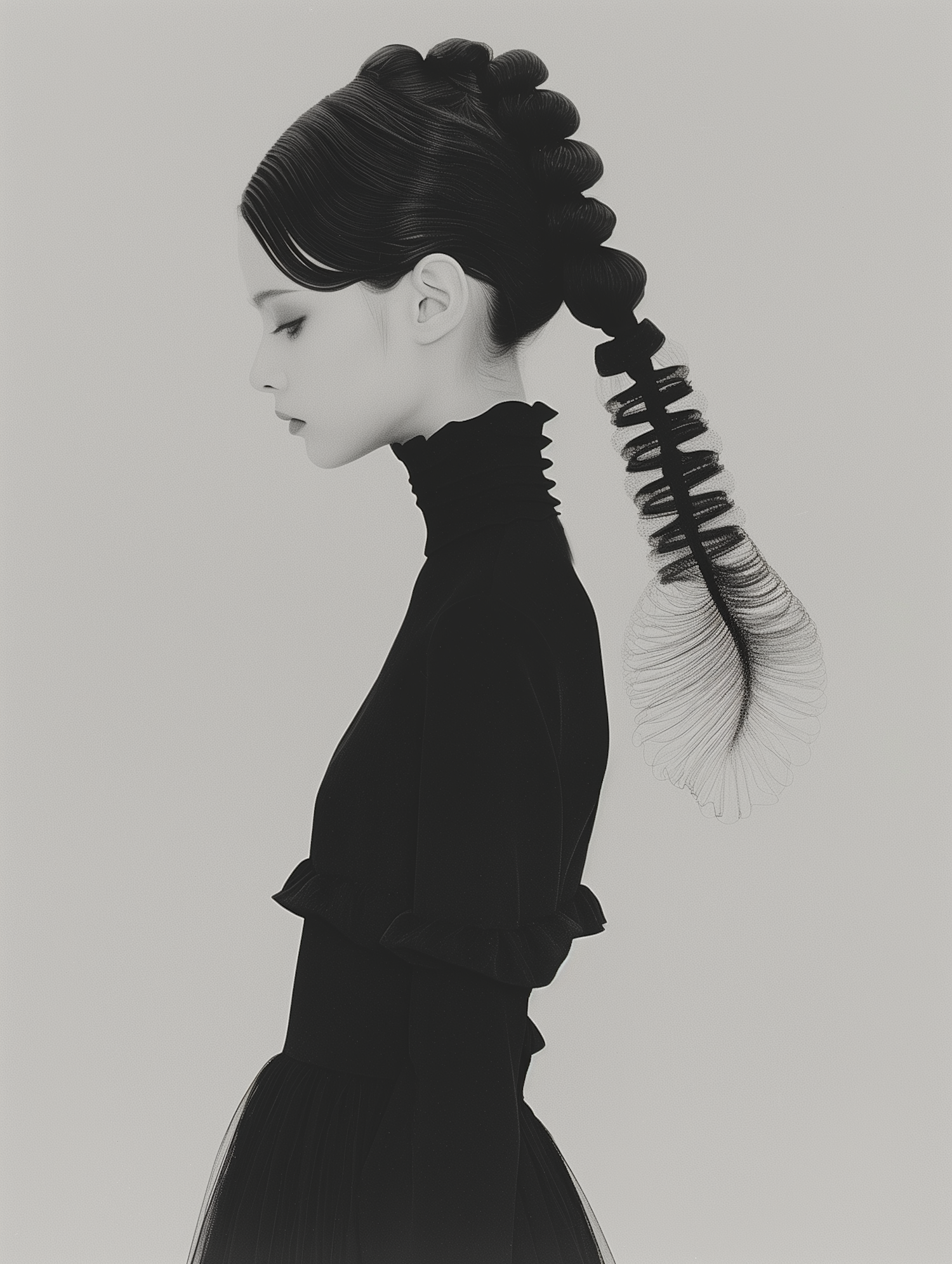 Elegant profile of a woman with intricate braided hairstyle and black dress, set against a soft gray background.