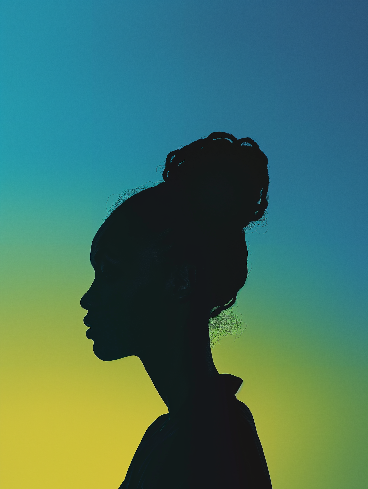 Silhouette of a person with a bun against a vibrant blue to yellow gradient background.