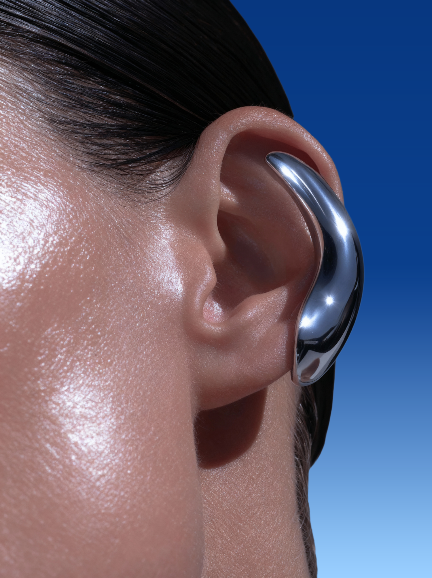 Close-up of an ear with a sleek silver crescent earring against a blue gradient background, emphasizing modern design and texture.