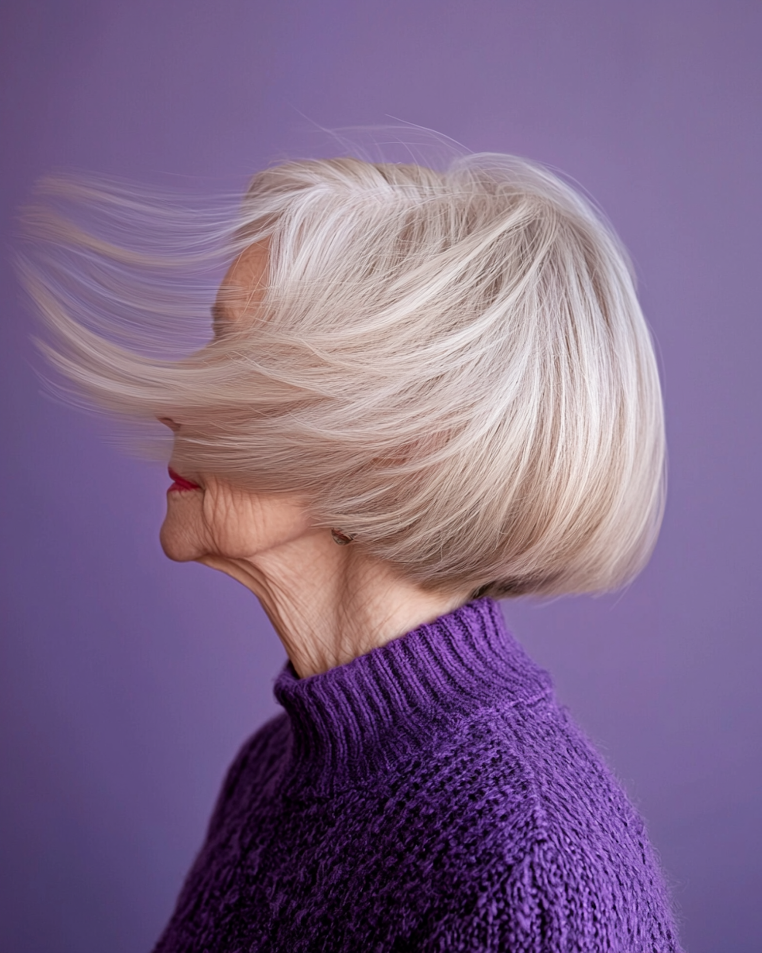 Side profile of an older woman with silver hair blowing in the wind, wearing a purple knit sweater against a soft purple background.