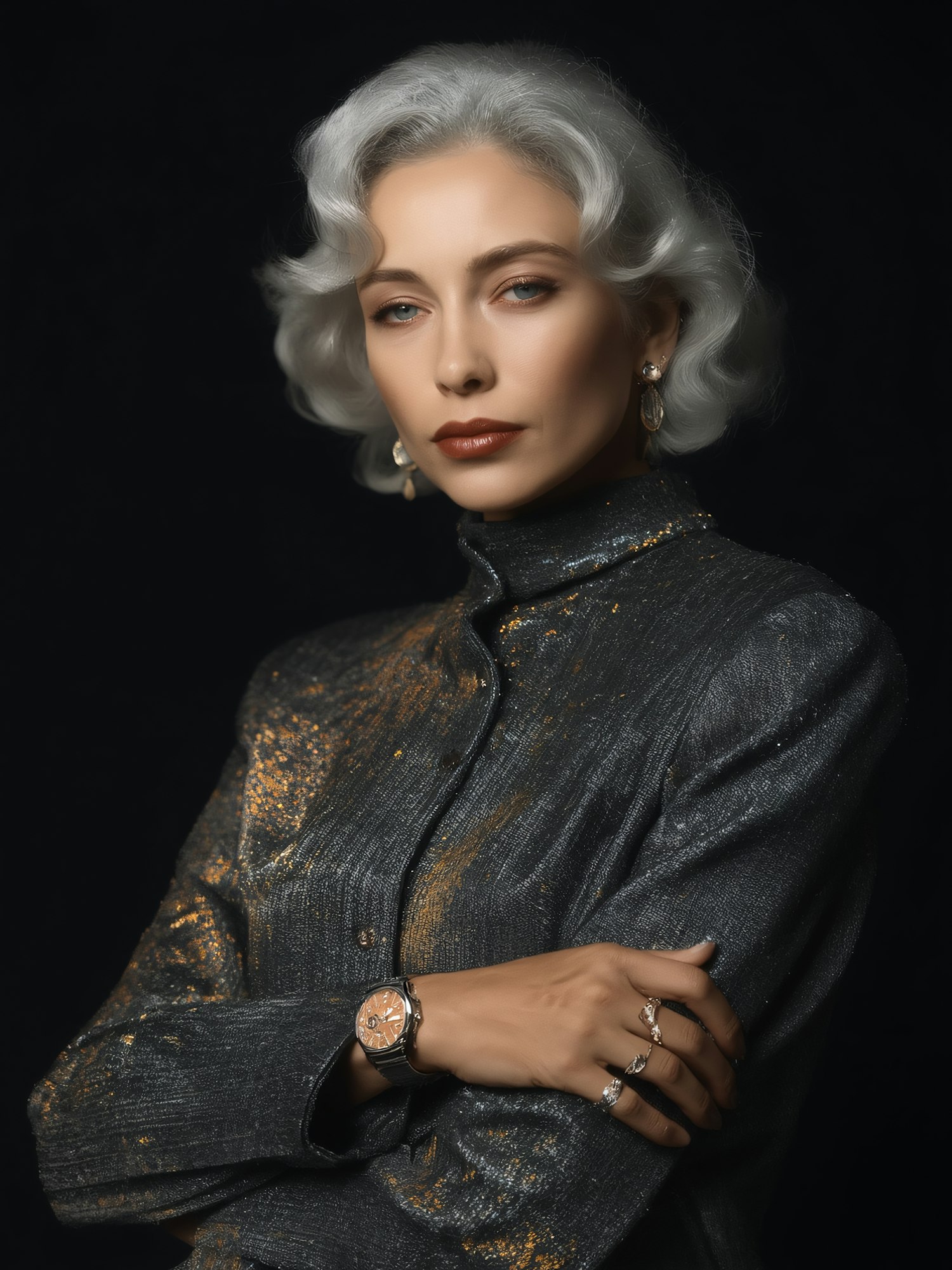 A sophisticated woman with silver hair in a shimmering gray jacket, accessorized with elegant jewelry, against a dark background.