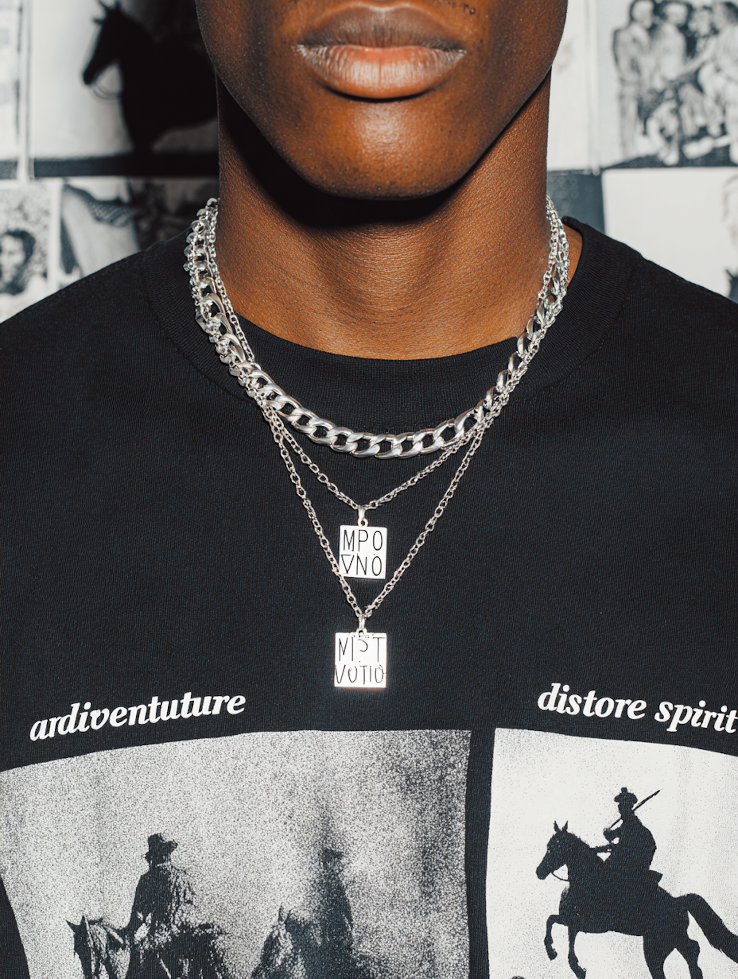 Stylish layered silver necklaces with pendants accent a black t-shirt featuring bold text and vintage western graphics.