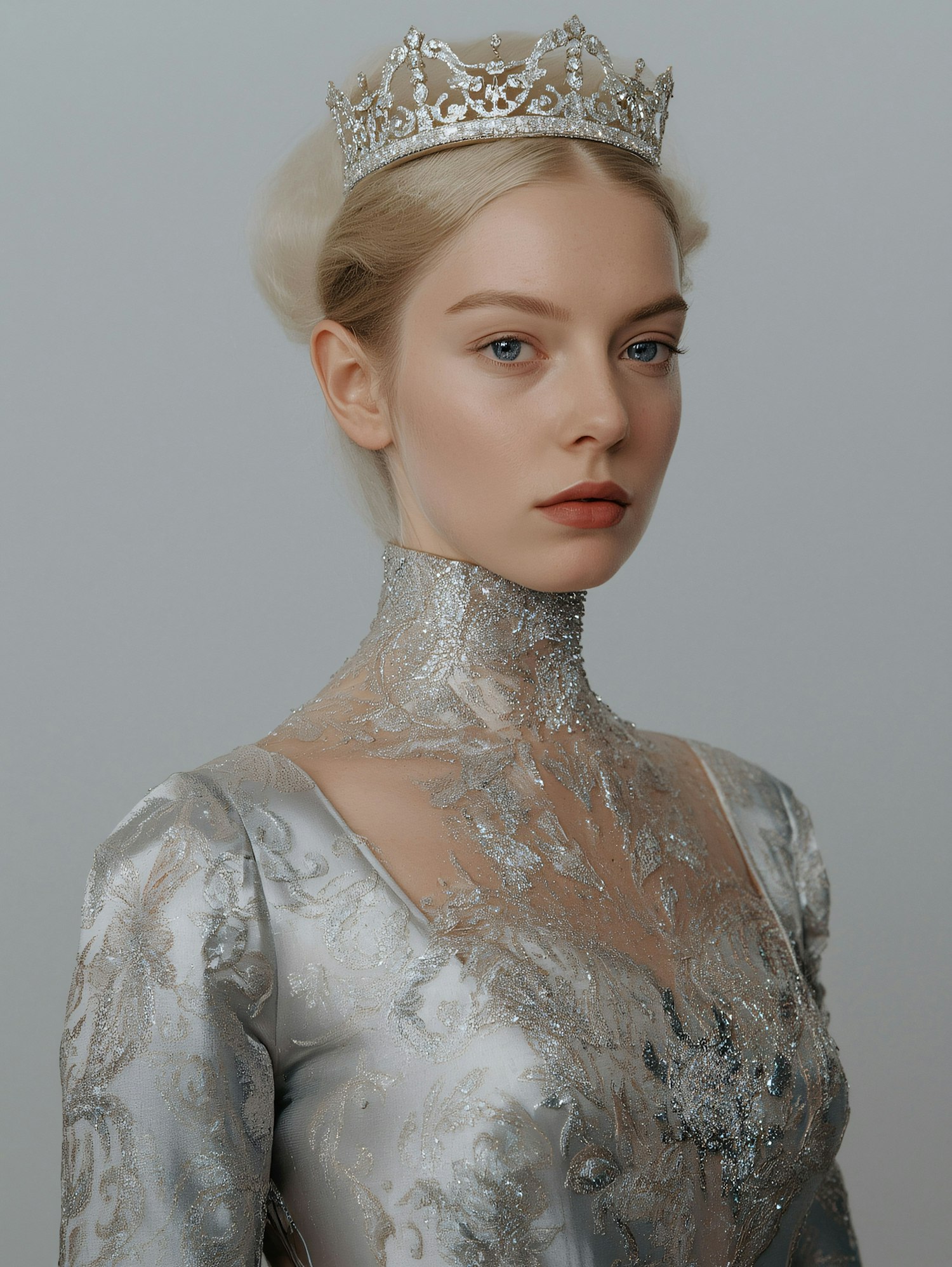 A regal portrait of a woman in a silver crown and gown, showcasing elegance and intricate details in a neutral setting.