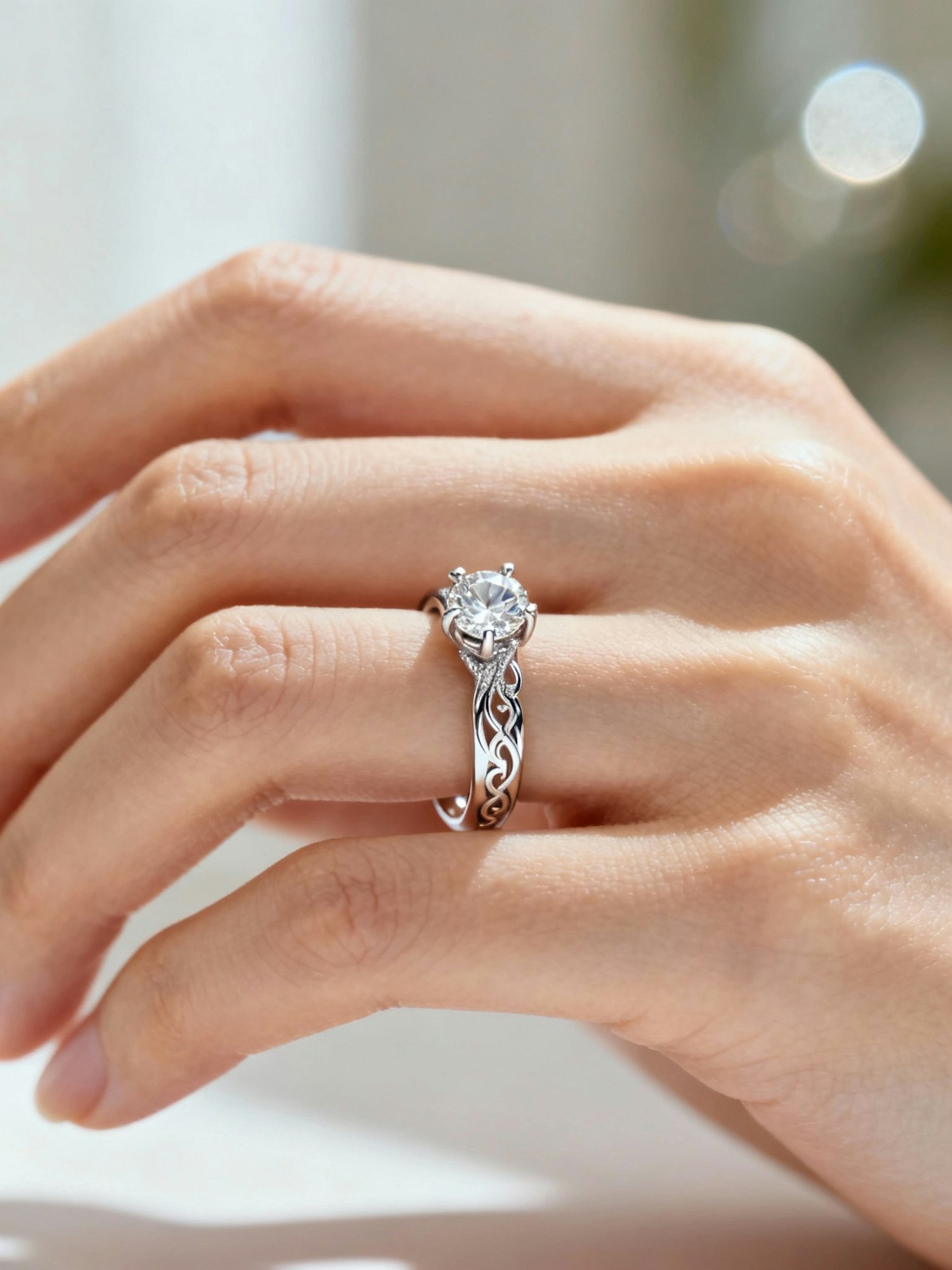 A stunning, elegant luxury ring worn on a female hand, high-quality metal and gemstone, intricate design, realistic reflection and shine, soft natural or studio lighting, minimal background, focus on details and craftsmanship, professional jewelry photography, sophisticated and refined aesthetic, showcasing elegance and femininity.