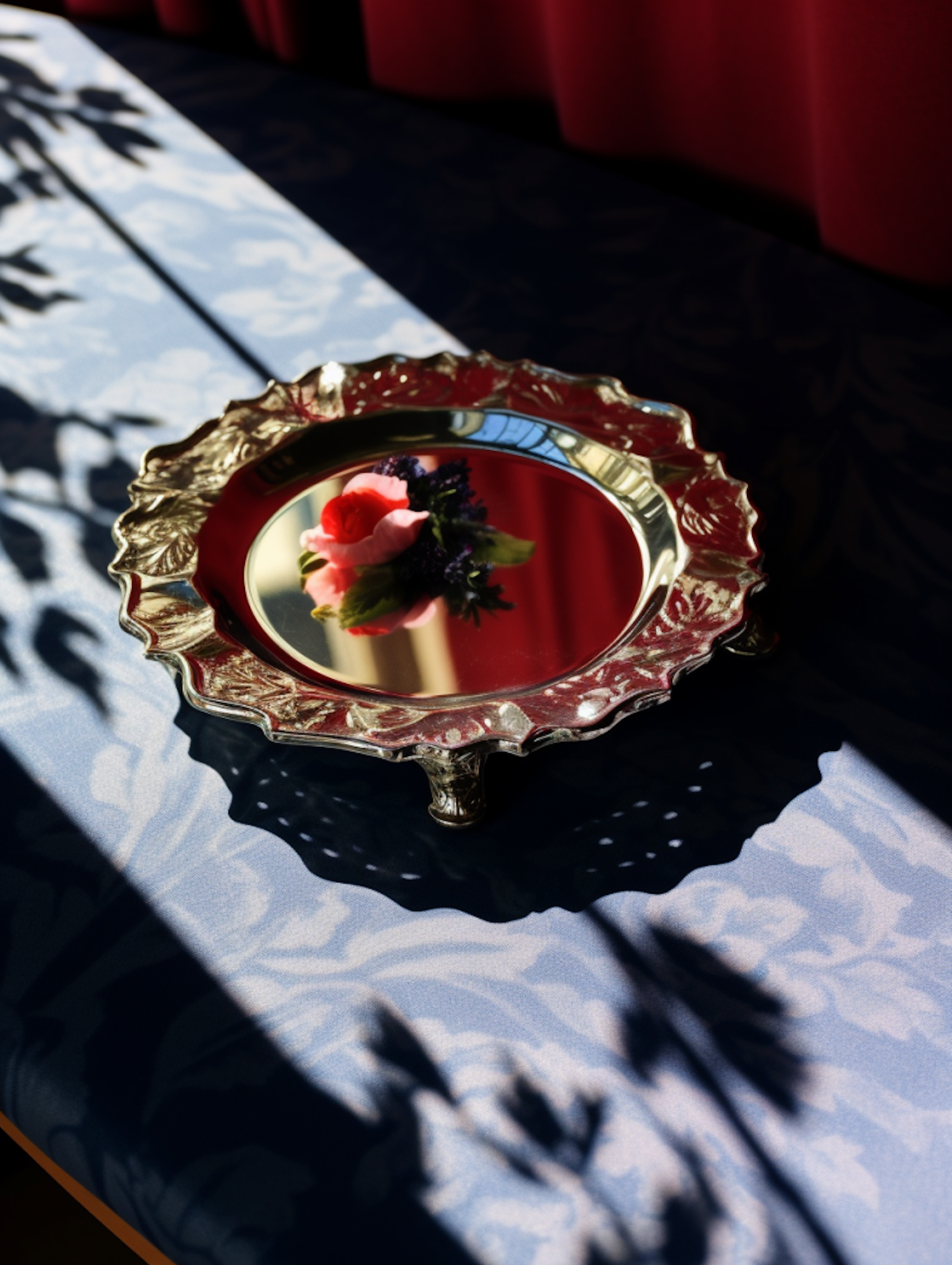 Ornate silver tray with flowers on a blue tablecloth, sunlight casting leaf shadows, against a red curtain backdrop.