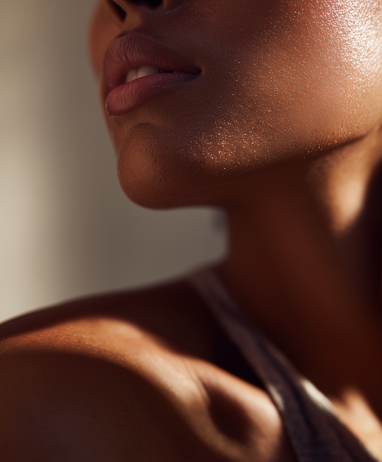 Close-up of a person's glowing skin and lips, with warm lighting emphasizing texture and natural beauty.