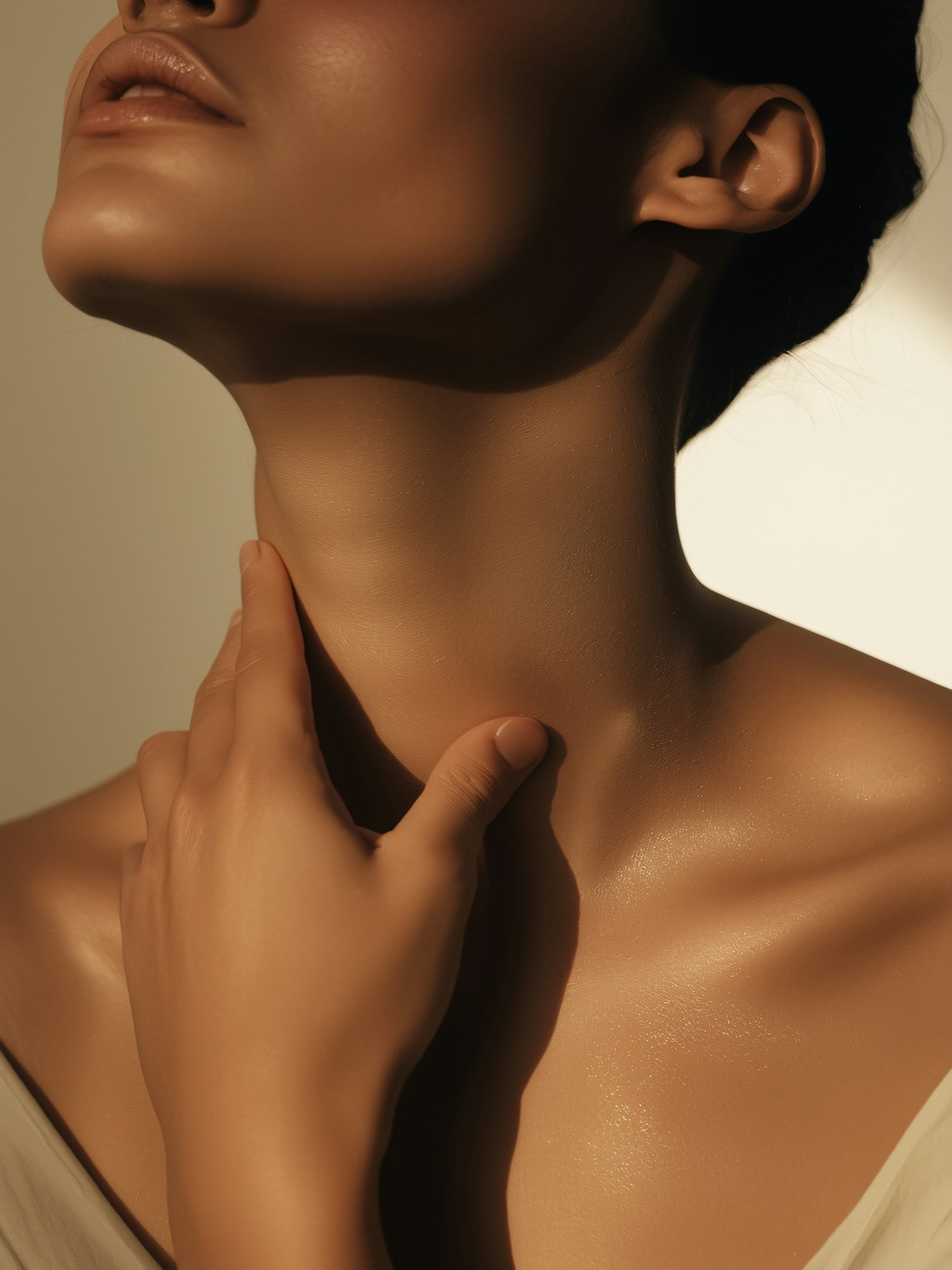 Close-up of a person's neck and hand under warm lighting, highlighting smooth skin and elegant contours.