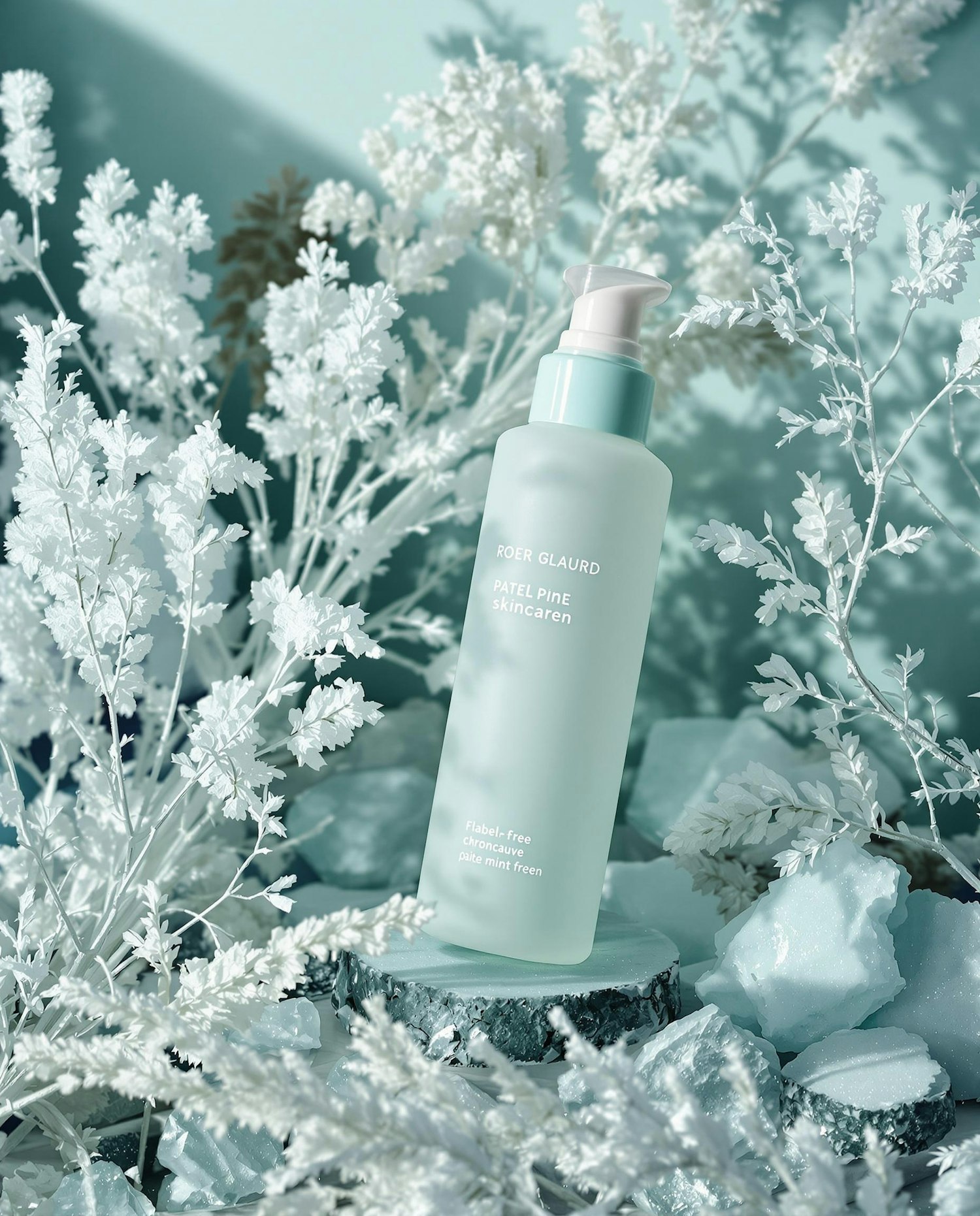 Elegant skincare bottle set against frosted white foliage and teal aesthetics; a serene composition evoking purity and sophistication.
