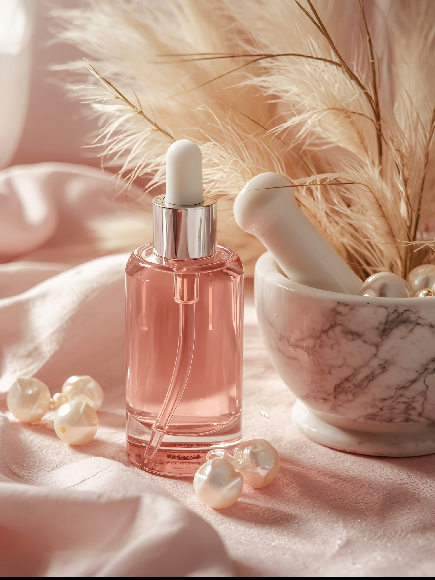 Elegant pink dropper bottle with pearls and pampas grass on soft fabric, creating a serene and luxurious aesthetic.