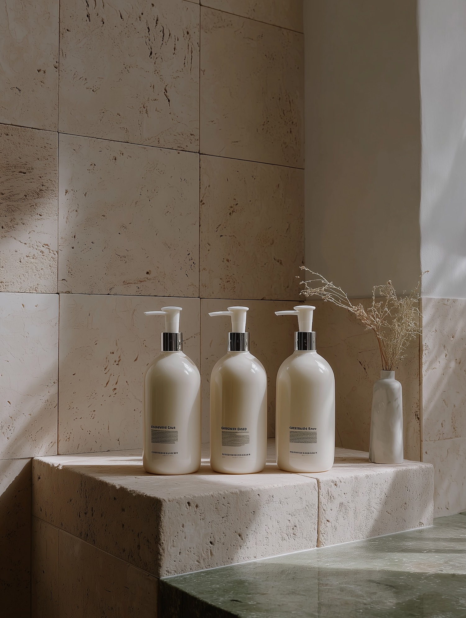 Three cream-colored bottles on a stone surface with a vase of dried flowers, set against a beige tiled background with soft lighting.