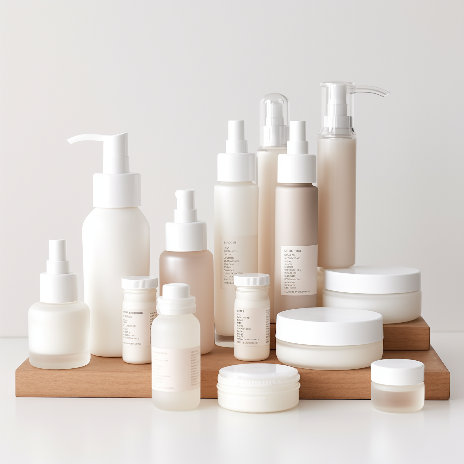 Minimalist skincare products in white and neutral tones on a wooden platform, showcasing clean and modern design.