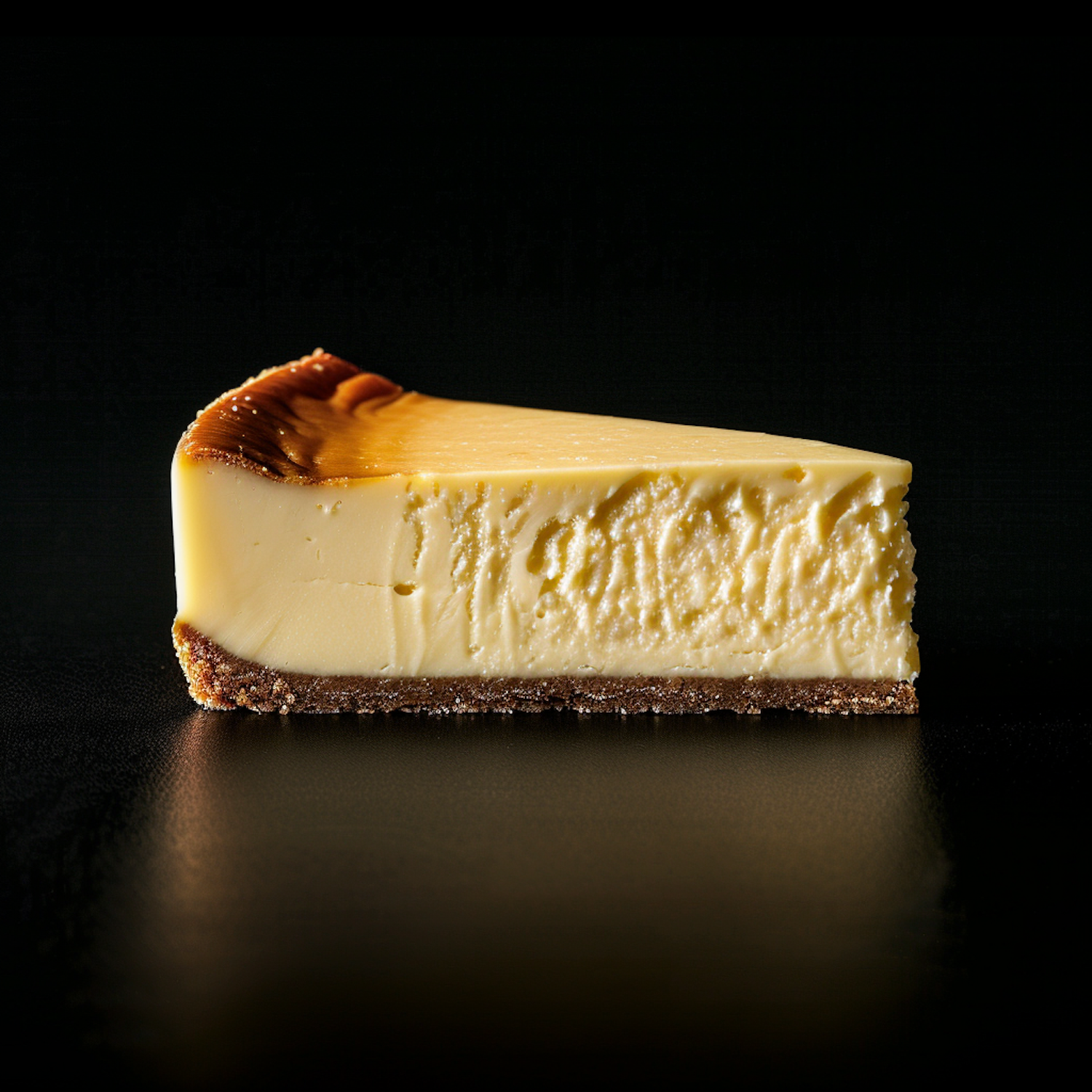 A creamy slice of cheesecake with a browned top and crumbly crust on a dark background, highlighting its rich texture and color.