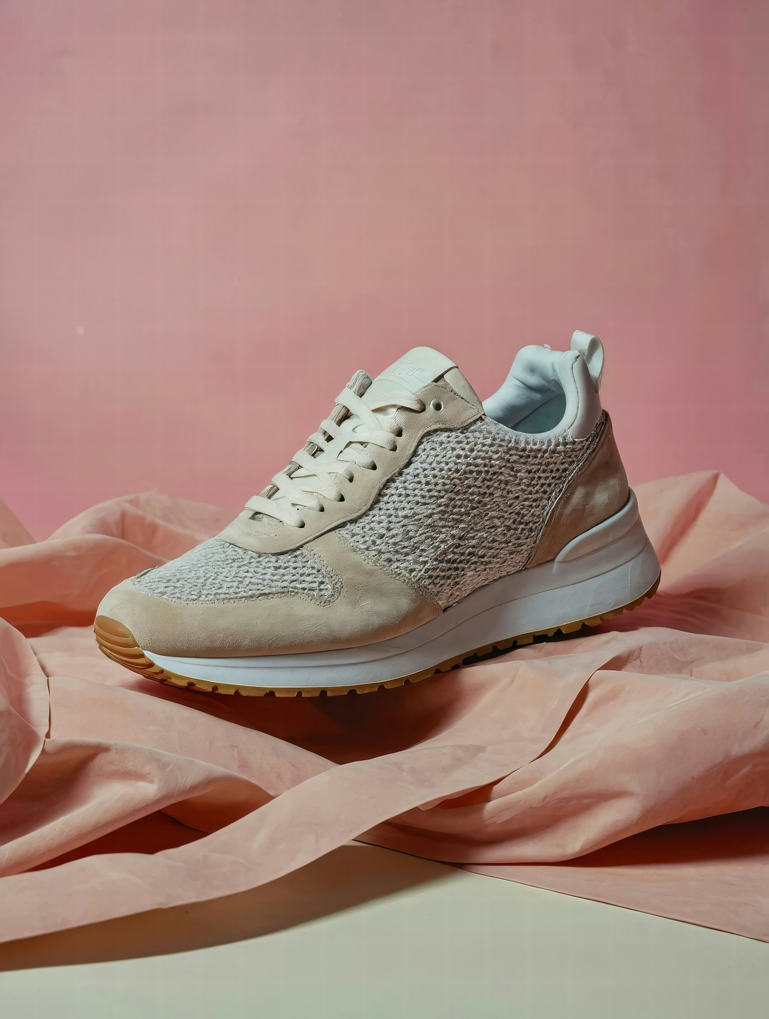 Elegant beige sneaker with knit and suede textures on a soft pink fabric backdrop, highlighting its stylish design.