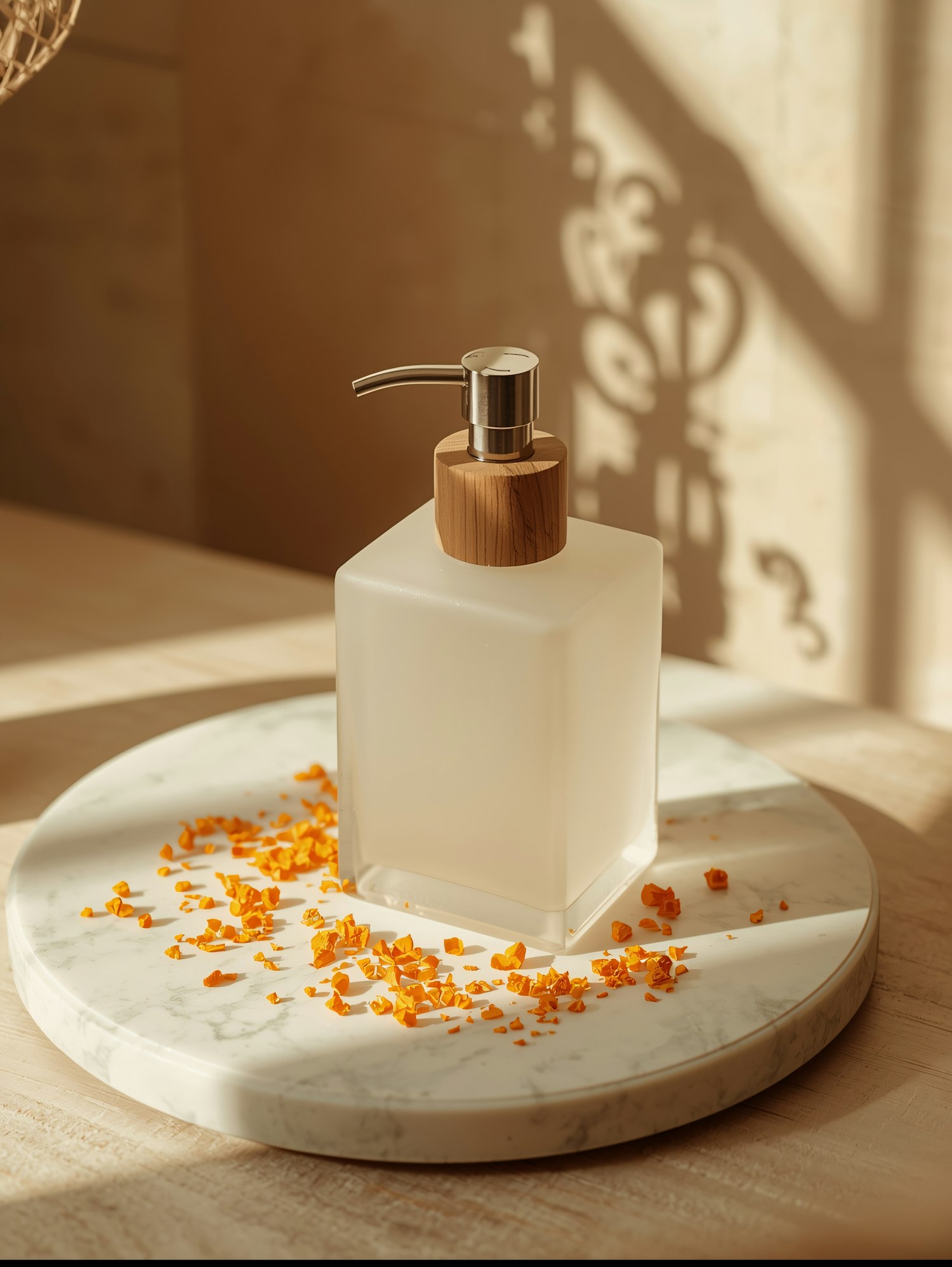 Elegant frosted glass soap dispenser with wooden accents on a marble tray, surrounded by orange petals and warm, artistic lighting.