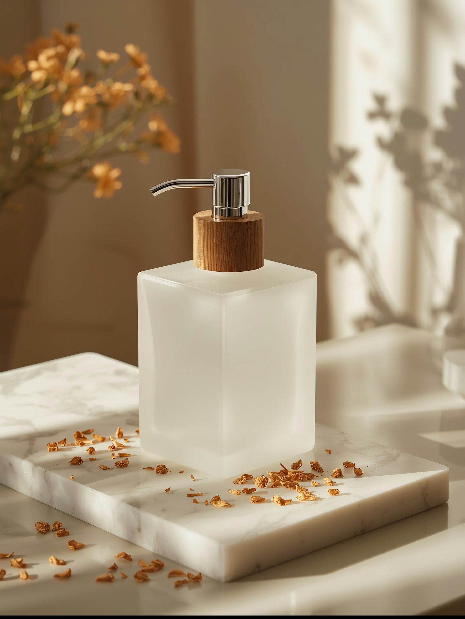 Elegant frosted glass soap dispenser with wooden accents on a marble surface, surrounded by dried petals and warm, soft lighting.