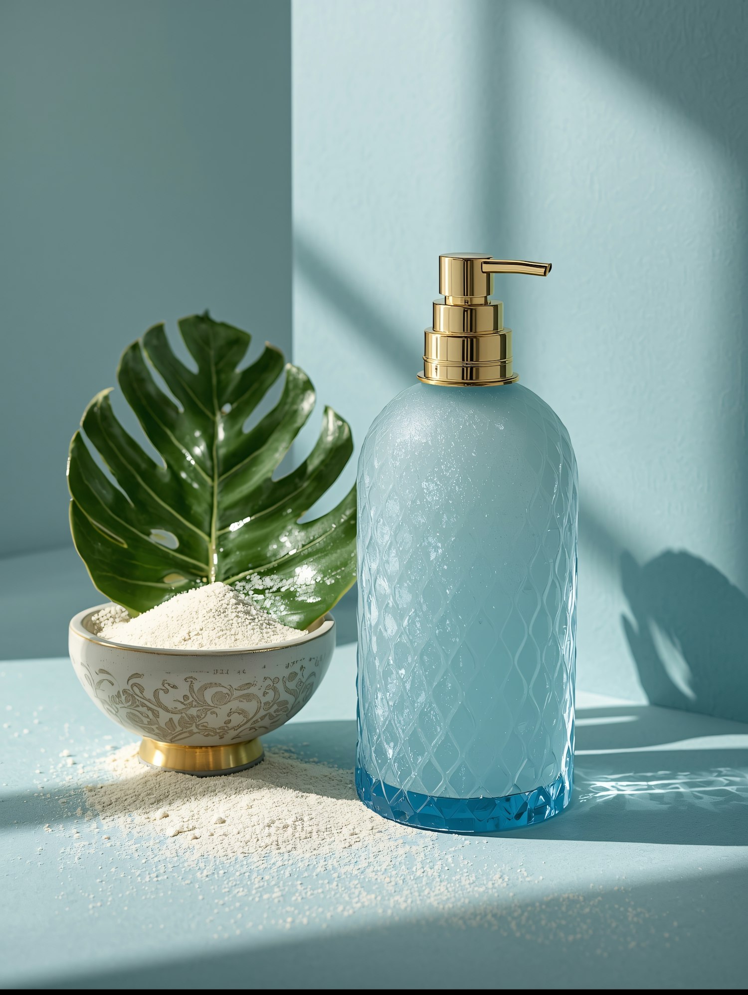 Elegant glass soap dispenser with gold pump, ornate bowl with powder, and a monstera leaf on a light blue background.