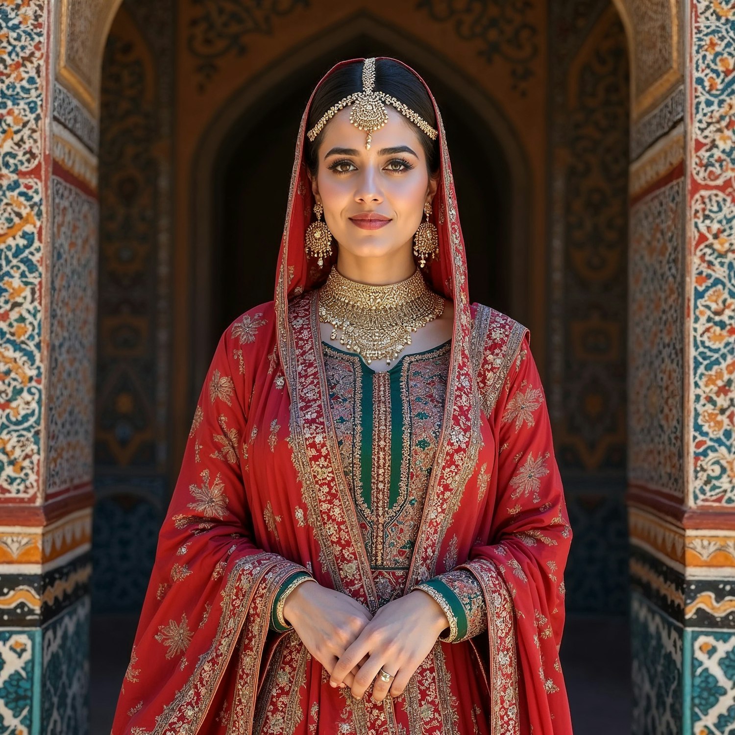 A woman in traditional South Asian attire with intricate jewelry stands before a beautifully patterned architectural backdrop.