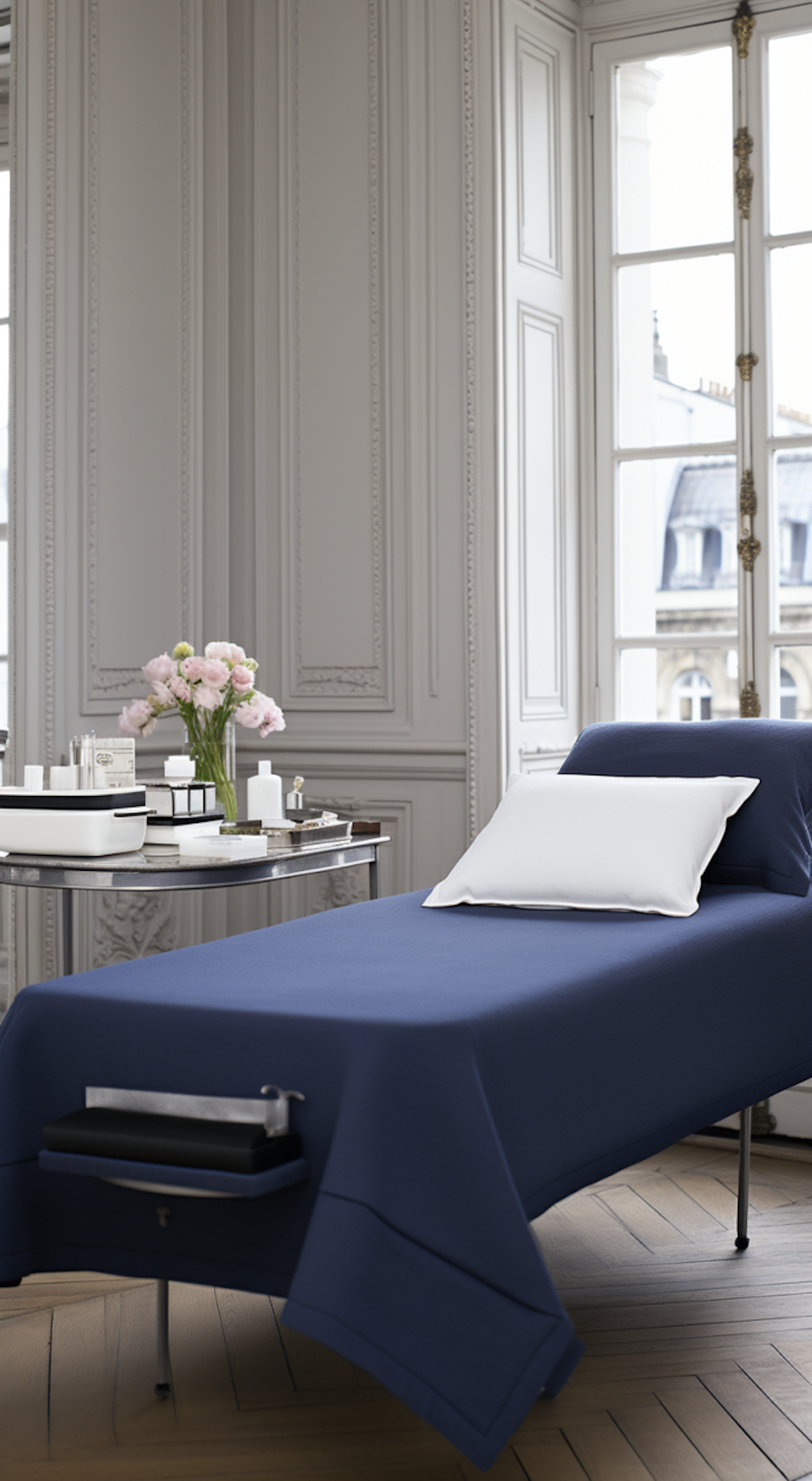 Luxurious spa room with a blue massage table, elegant decor, and natural light. Perfect for relaxation and rejuvenation.