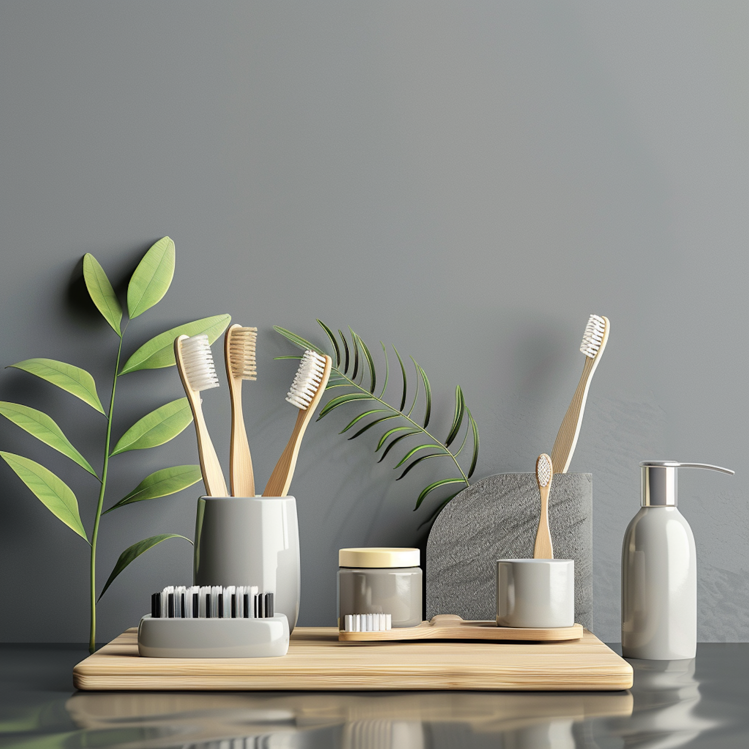 Minimalist bathroom setup with bamboo toothbrushes, ceramic holders, and green leaves for a natural, eco-friendly aesthetic.