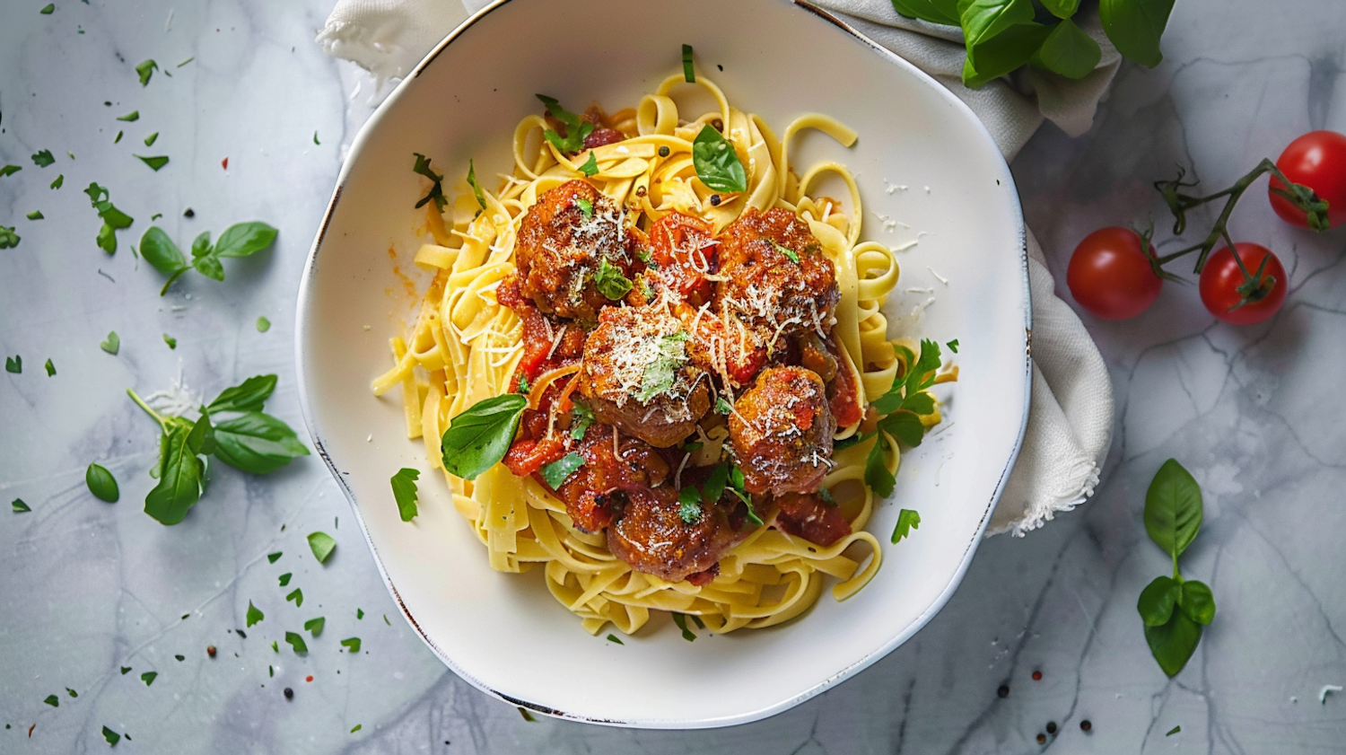 Delicious pasta with meatballs in tomato sauce, garnished with fresh basil and cheese, served in a white bowl on a marble surface.