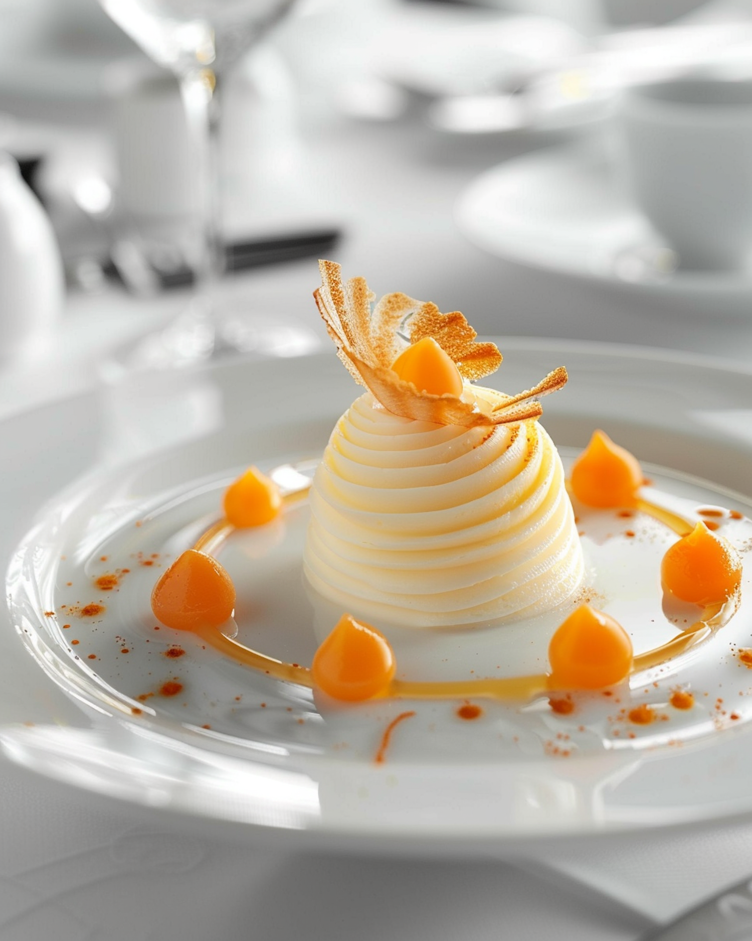 Elegant dessert with spiral mousse, orange dollops, caramel drizzle, and wafer garnish in a fine dining setting.
