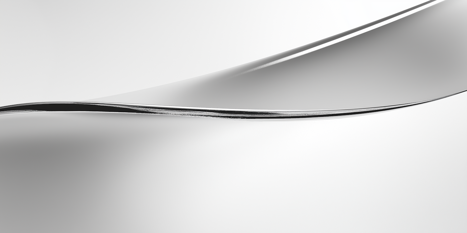 Minimalist close-up of a sleek, curved metallic object, likely a spoon, with a reflective surface and clean white background.