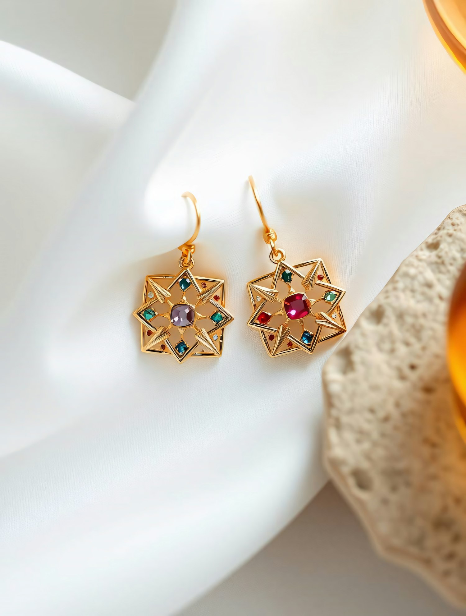 Elegant gold earrings with star-shaped design, featuring vibrant gemstones in red, purple, green, and blue on a soft white fabric.