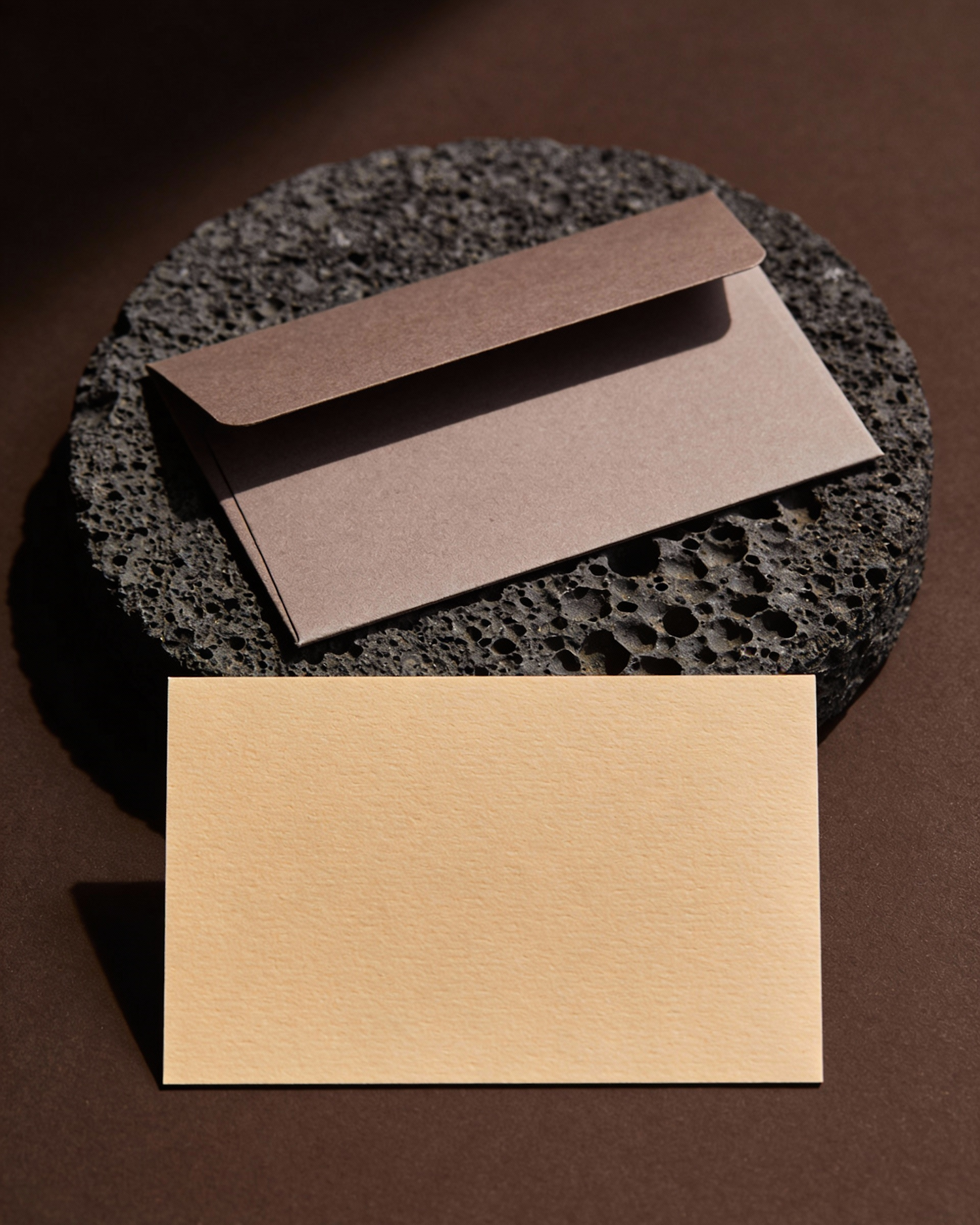 Minimalist stationery set with a beige envelope and card on a textured stone surface, perfect for elegant correspondence.