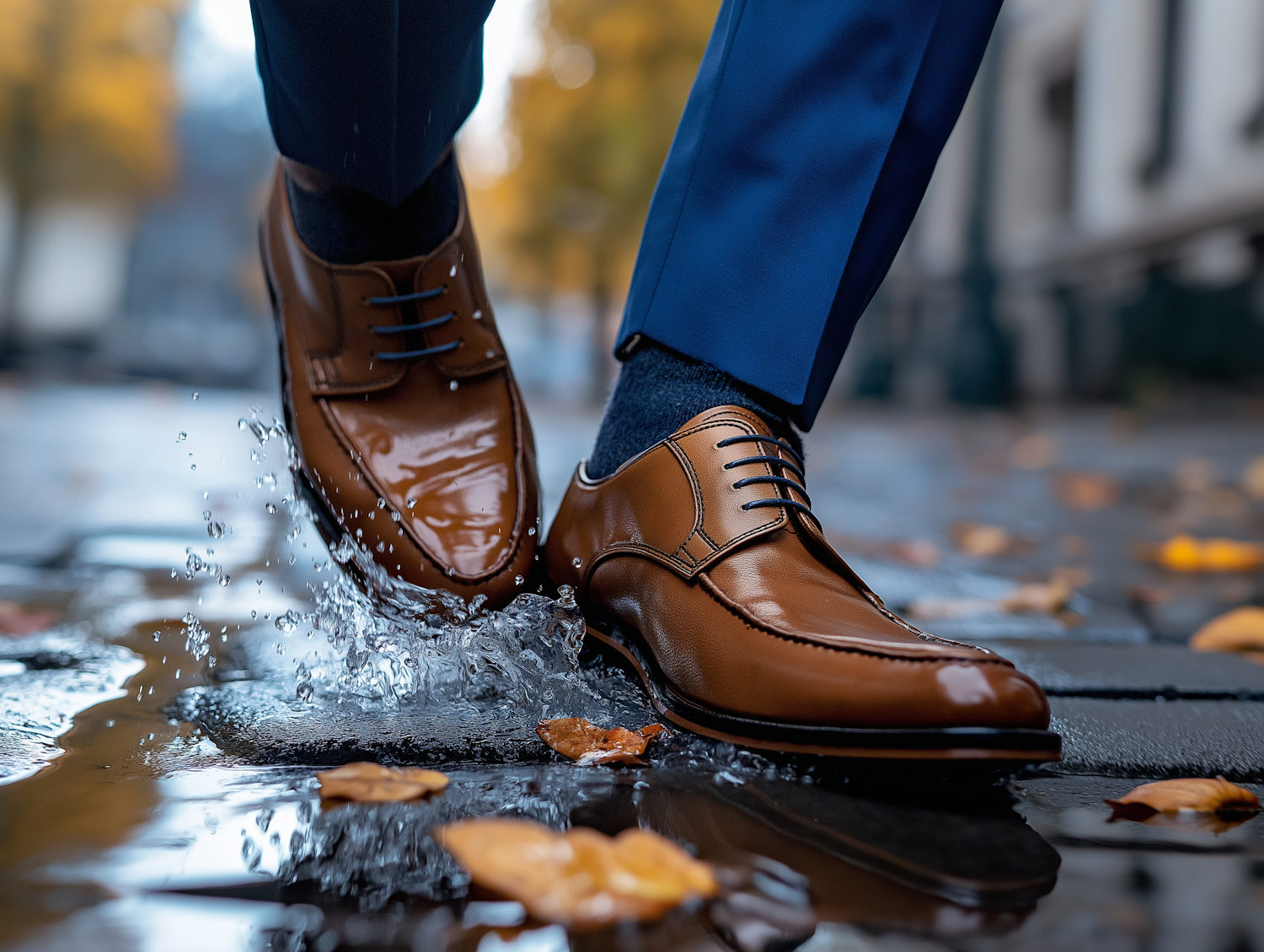 Close-up of polished brown leather shoes splashing in a puddle, paired with blue trousers, on a wet autumn street with fallen leaves.