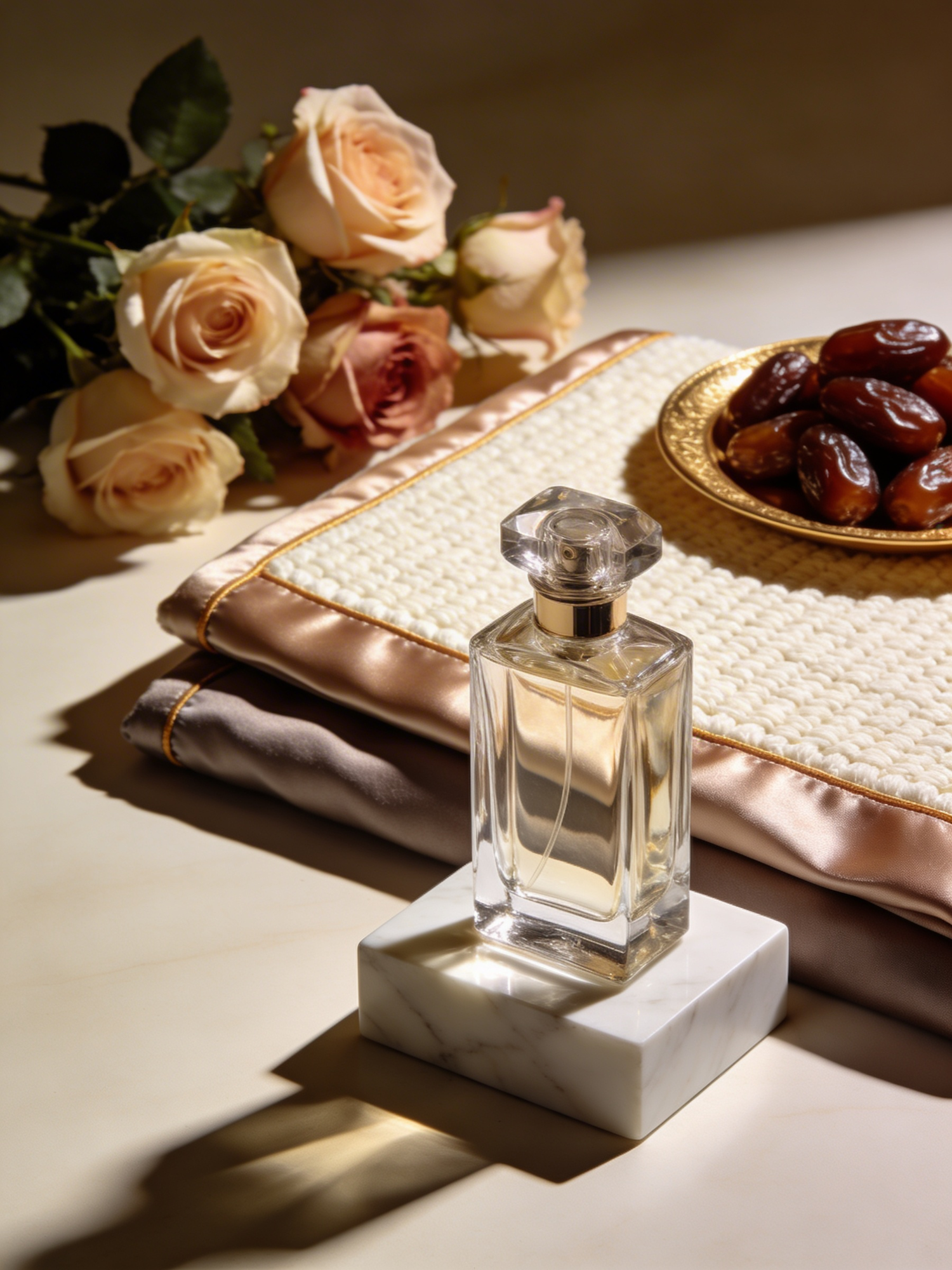 A high‑definition ultra‑luxury Ramadan composition. A perfume bottle displayed on a white‑marble pedestal stands beside two layered folded mats: one woven cream cotton, one taupe with silk edging. A small arrangement of roses and a gold‑rimmed plate of dates add softness. Warm directional lighting creates sculptural shadows. No text, no logos.
