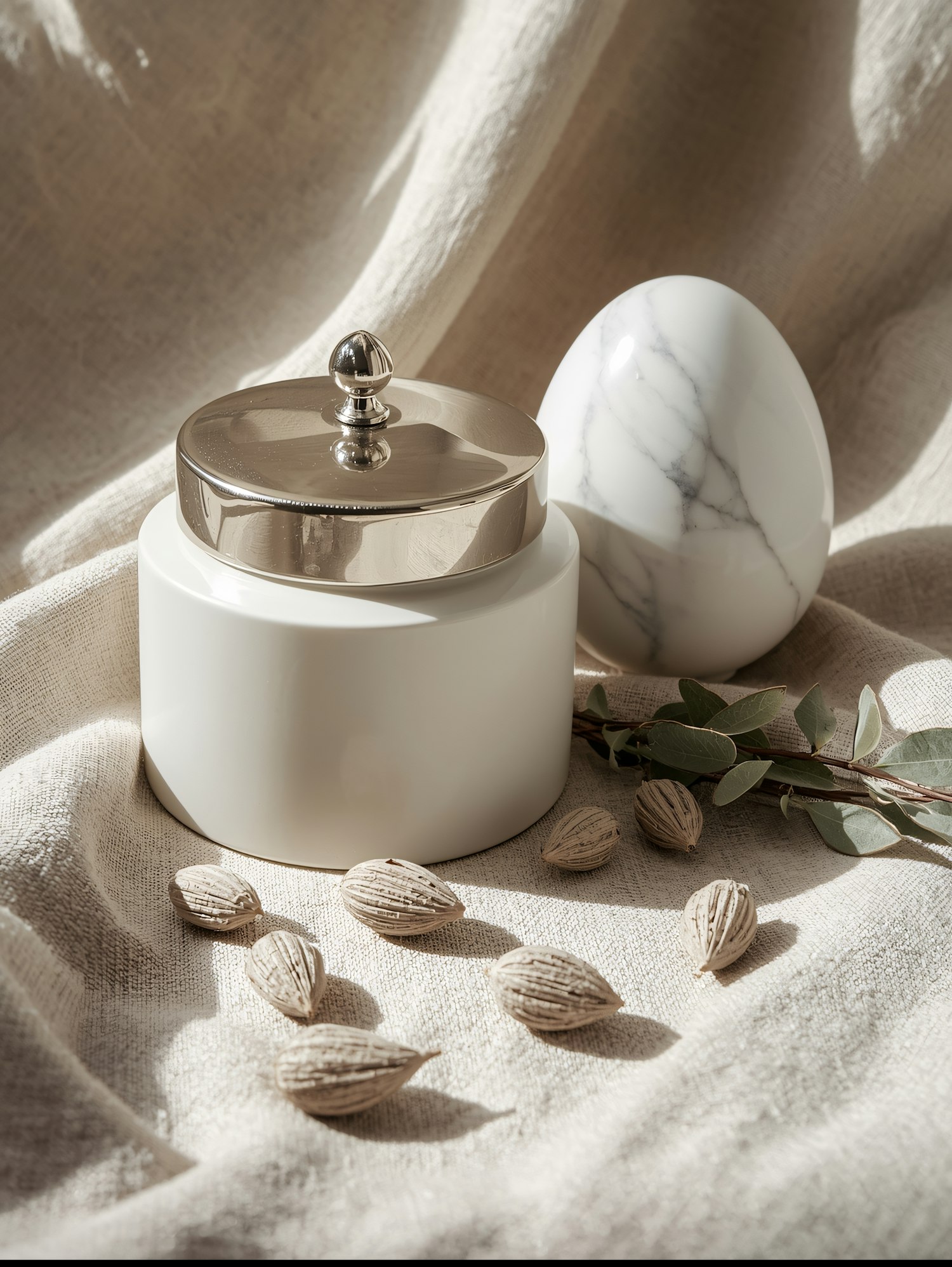 Elegant still life with a white ceramic jar, marble egg, dried seeds, and greenery on a soft beige fabric background.