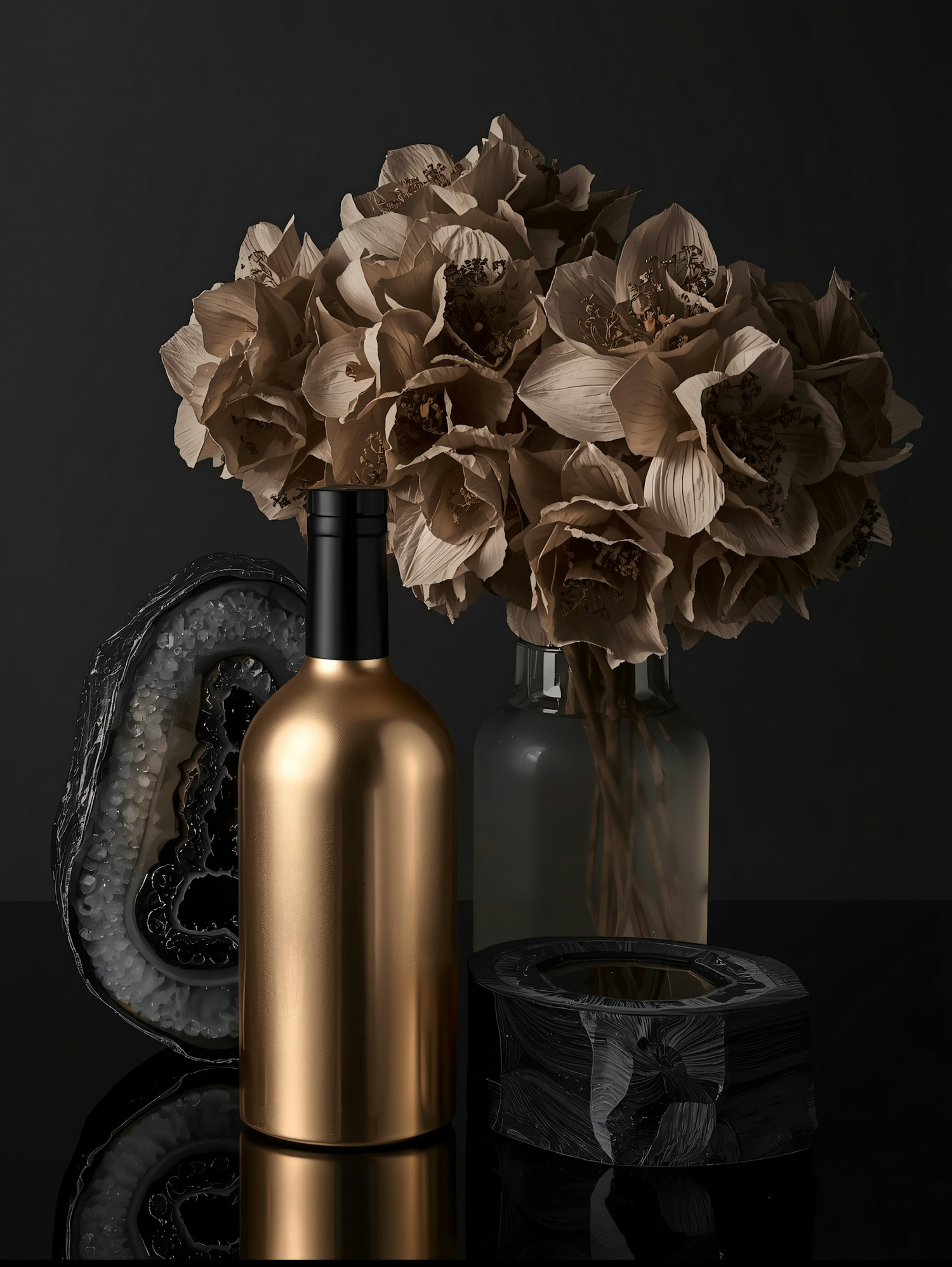 Elegant still life with a gold bottle, beige flowers, and geode accents on a reflective surface, set against a dark background.