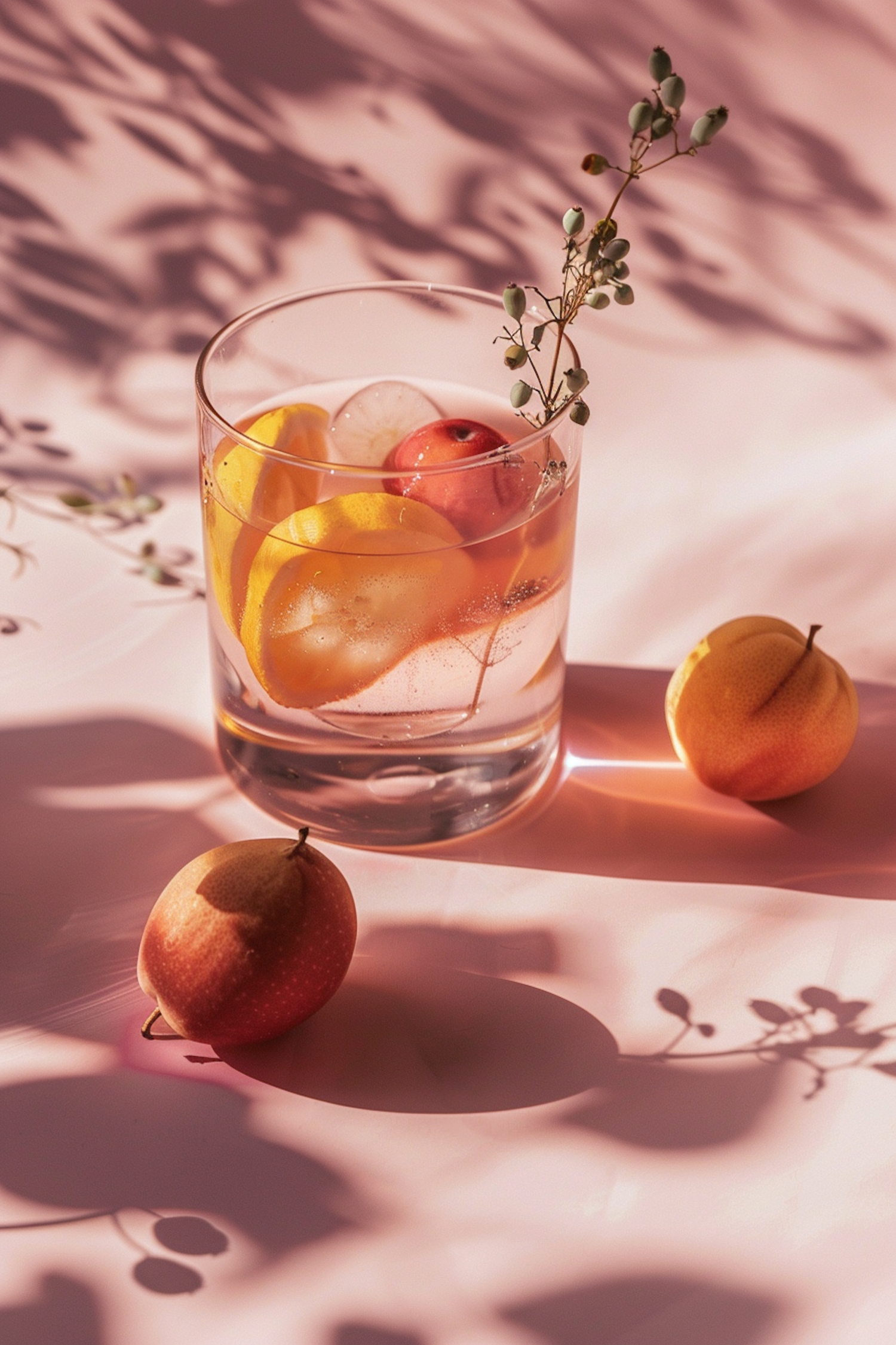 Elegant glass of fruit-infused drink with orange slices, red fruit, and garnish, surrounded by apricots on a soft pink surface.