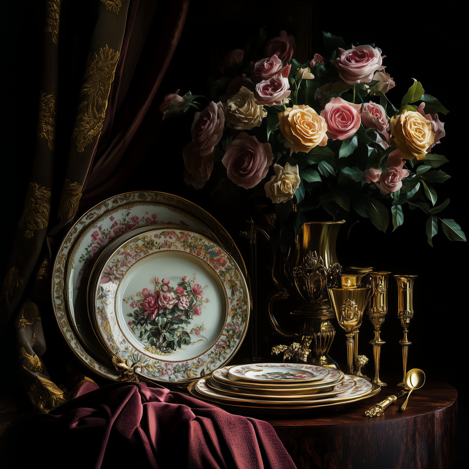 Elegant still life with floral china, golden goblets, and a rose bouquet in moody lighting, exuding luxury and sophistication.
