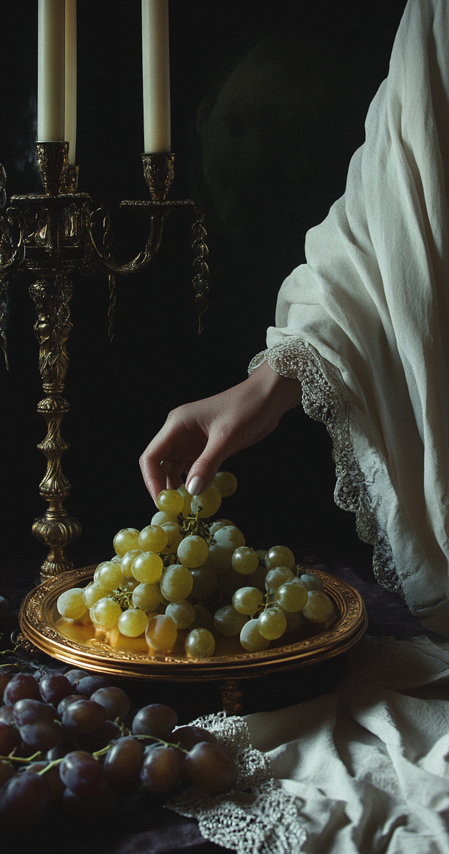 Elegant hand reaching for grapes on a golden plate, with a brass candelabrum and lace details in a classic still life setting.