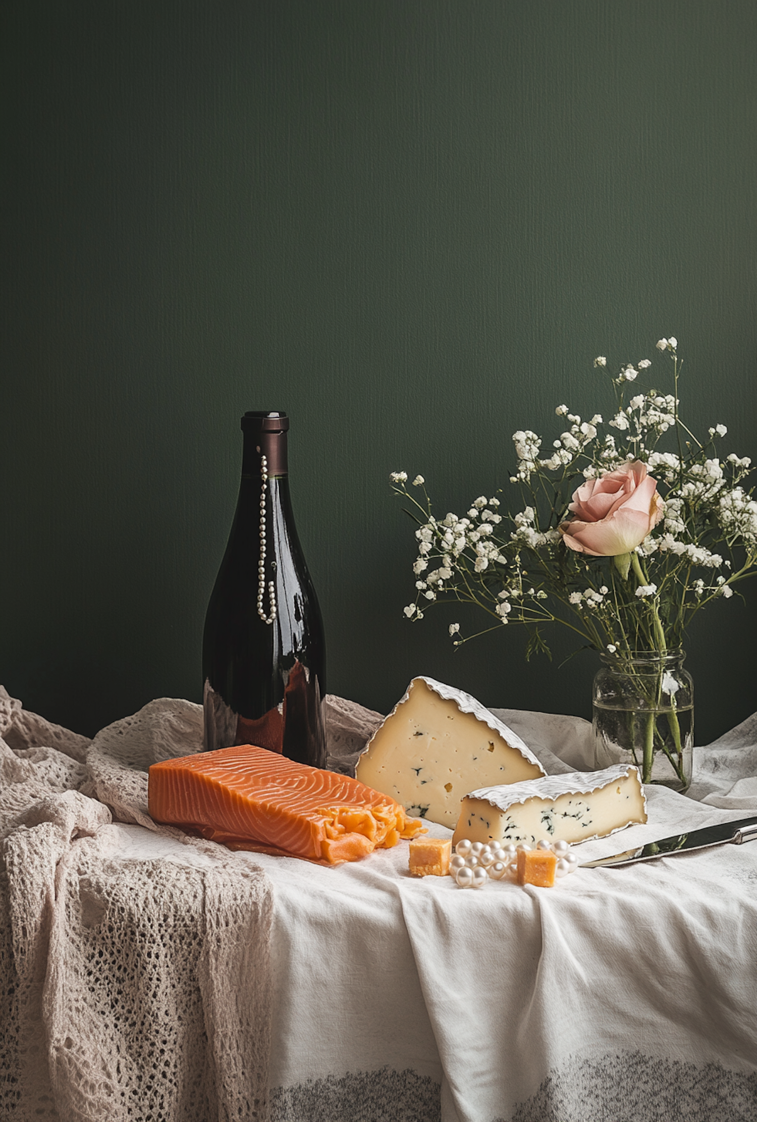 Elegant still life with wine, salmon, blue cheese, and flowers on a textured cloth against a dark green backdrop.