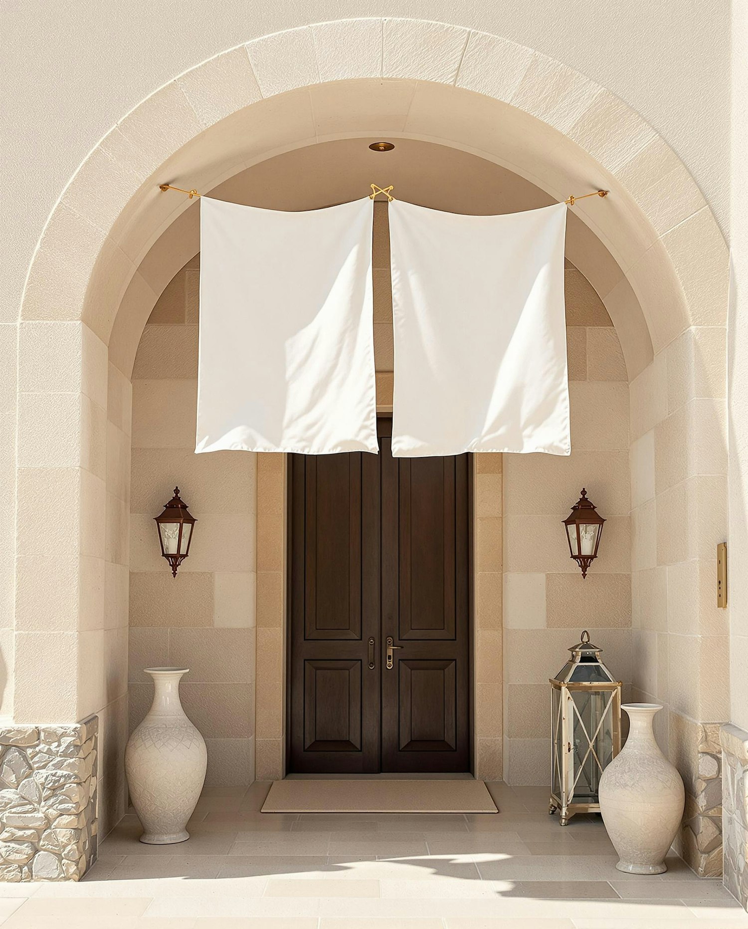 Elegant entrance with wooden double doors, white fabric panels, ceramic vases, and lanterns under a stone archway. Neutral tones and symmetry.