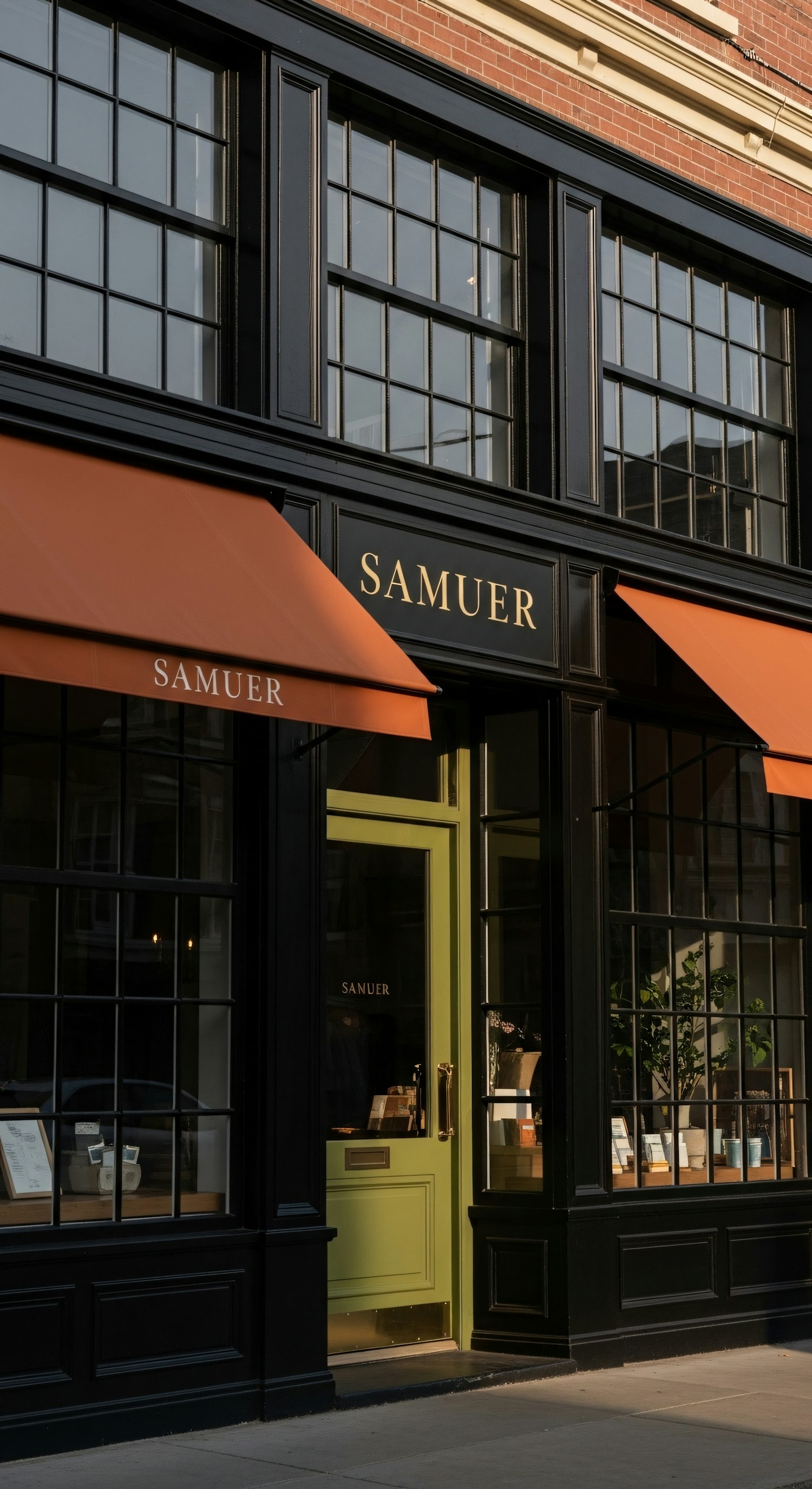 Charming storefront with black-framed windows, orange awnings, and a green door, showcasing a stylish and inviting design.