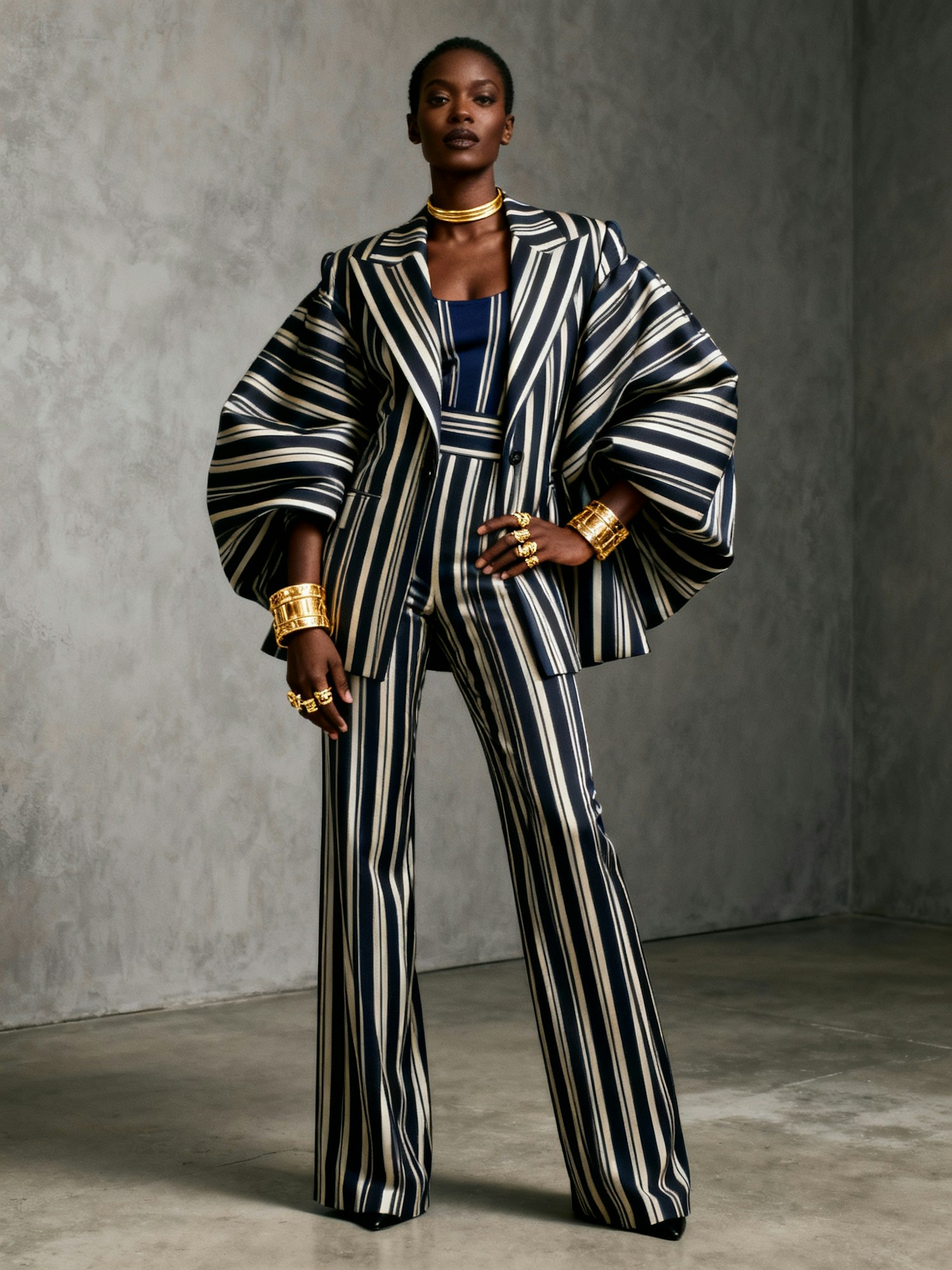 Full-body portrait of a black woman wearing a luxurious, corporate outfit featuring bold, 2 coloured vertical stripes with a matching inner wear for modesty. The outfit has a voluminous sleeves, She is accessorized with chunky, statement gold cuff bracelets on both wrists, several gold rings, and a thin gold choker necklace. The pose is confident and elegant, The background is a minimalist composition of textured gray walls and a smooth concrete floor. Soft, even lighting meticulously highlights the rich textures of her garment and the intensity of her expression. The style is cinematic, sharply focused, and exudes an artistic high-fashion vibe that emphasizes her bold presence.
