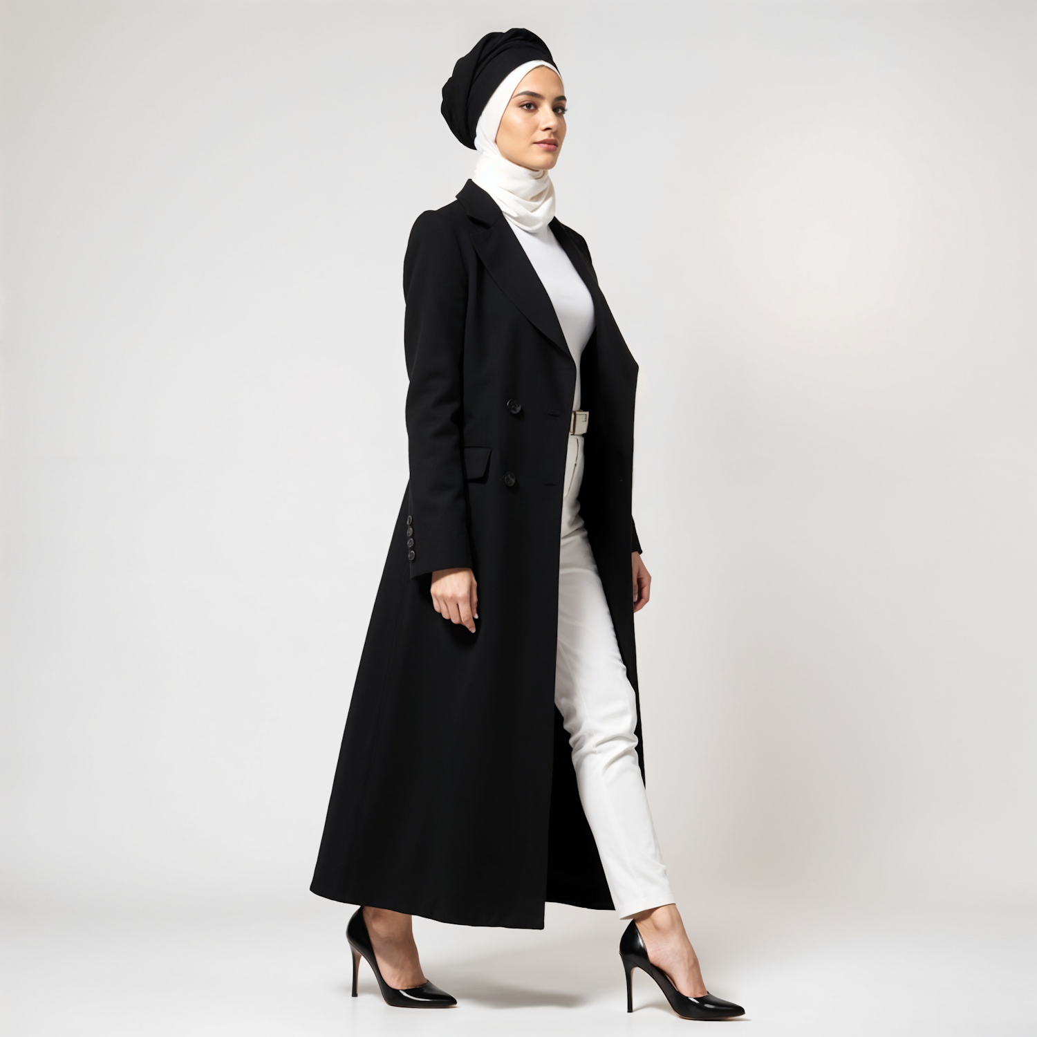 Stylish woman in a black long coat, white pants, and a turban-style headscarf walking confidently in a minimalist studio setting.