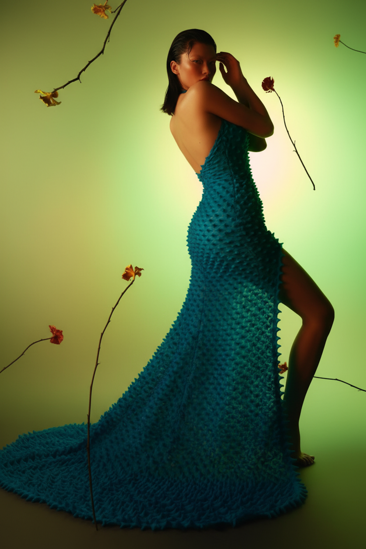 A person in a textured blue gown poses against a green gradient background with floral branches, creating a modern and artistic composition.