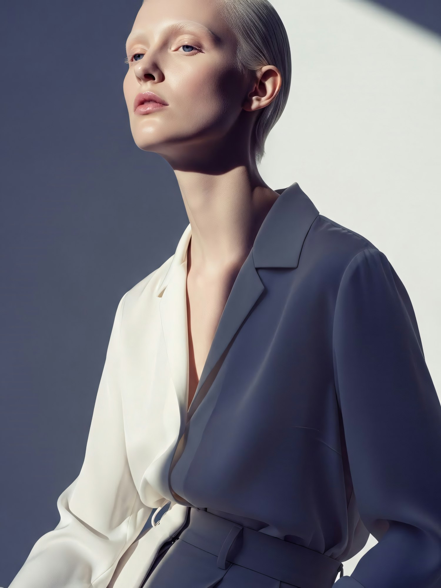 A stylish individual in a white blouse and blue blazer, captured in dramatic lighting with a neutral background.