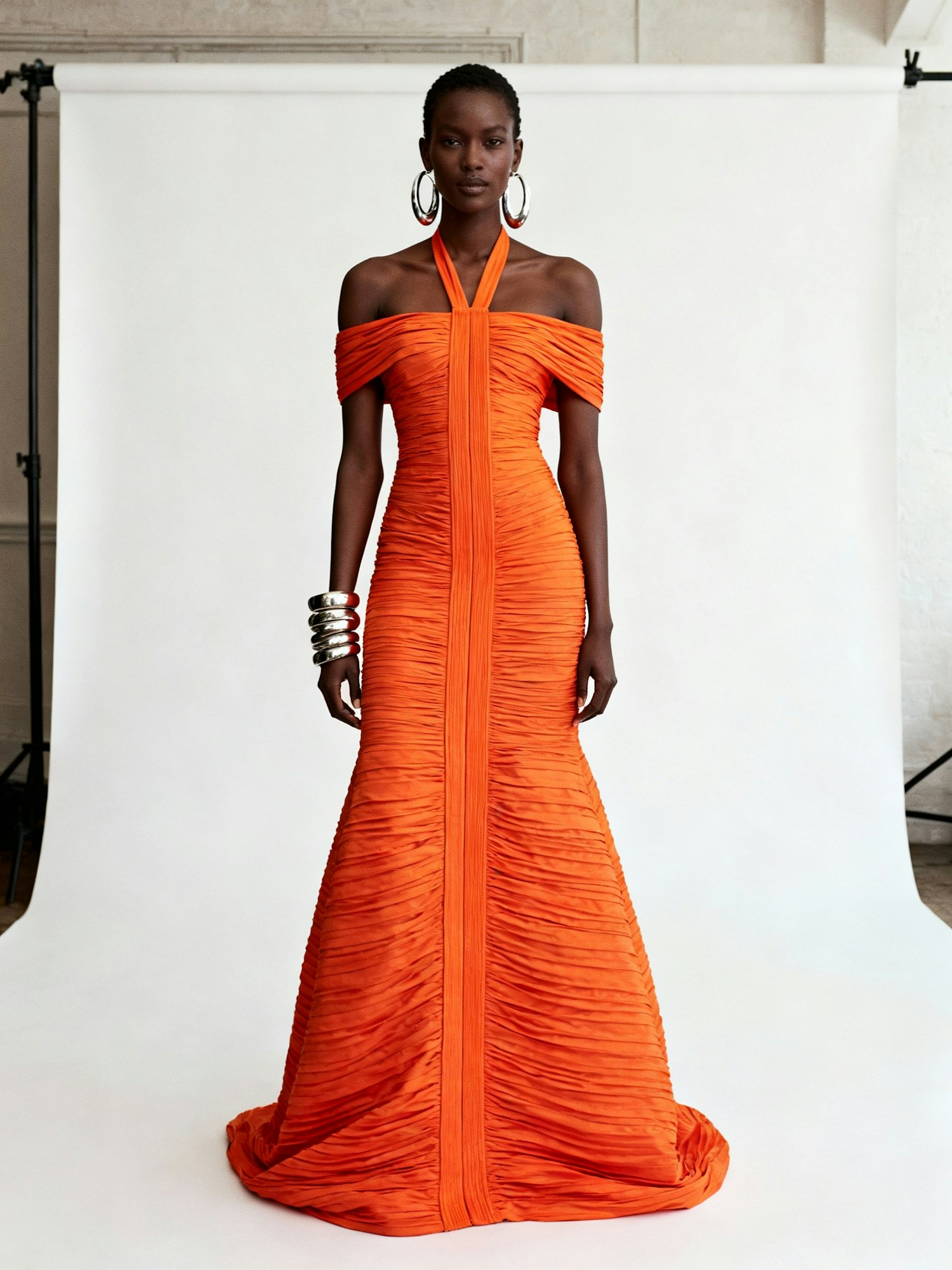 A high-fashion editorial photograph of a Black woman standing against a plain white studio backdrop. She wears a striking, floor-length orange gown with an off-the-shoulder neckline and a halter-style strap that connects at the neck. The gown features a ruched texture throughout, with a central vertical panel running symmetrically from the neckline to the hem, creating a structured and sculptural silhouette. She accessorizes with large statement earrings and multiple bold bracelets on one wrist, adding metallic contrast and visual rhythm. The lighting is soft and neutral, highlighting the gown’s texture and the contours of her figure. The mood is confident, radiant, and refined—celebrating bold color, intricate detailing, and empowered femininity in a minimalist setting.
