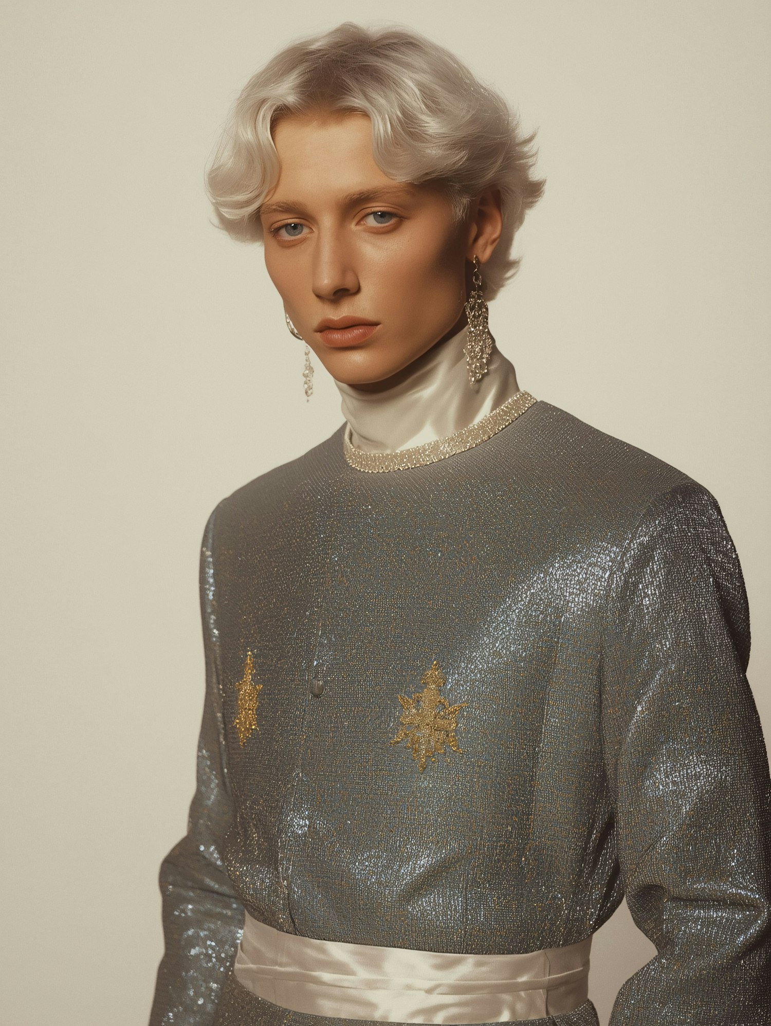 A person with platinum blonde hair in a shimmering silver outfit with golden details and elegant earrings, set against a plain background.